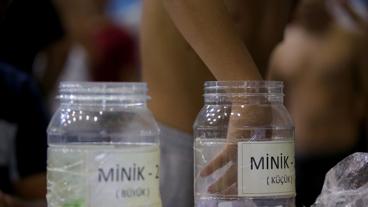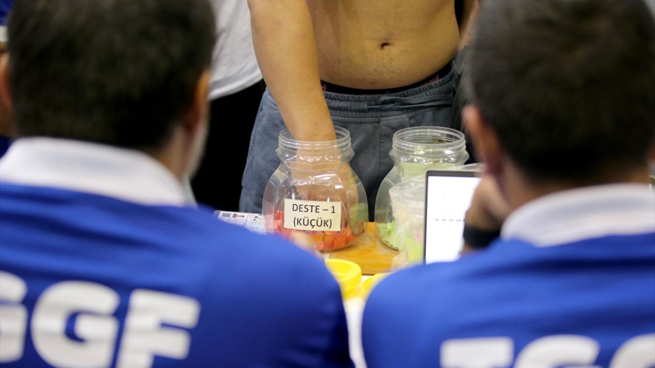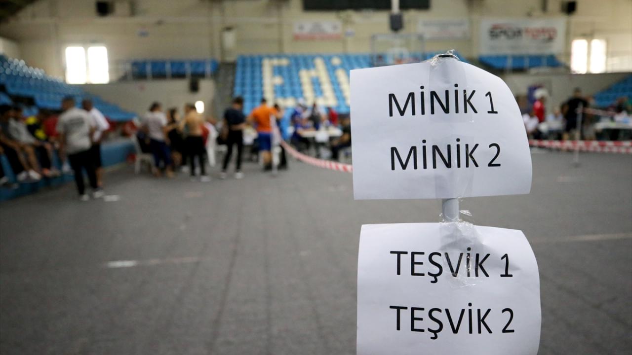 Farklı boylardaki pehlivanlar, Mimar Sinan Spor Salonu`nda oluşturulan platformlarda kayıtlarını yaptırıyor.