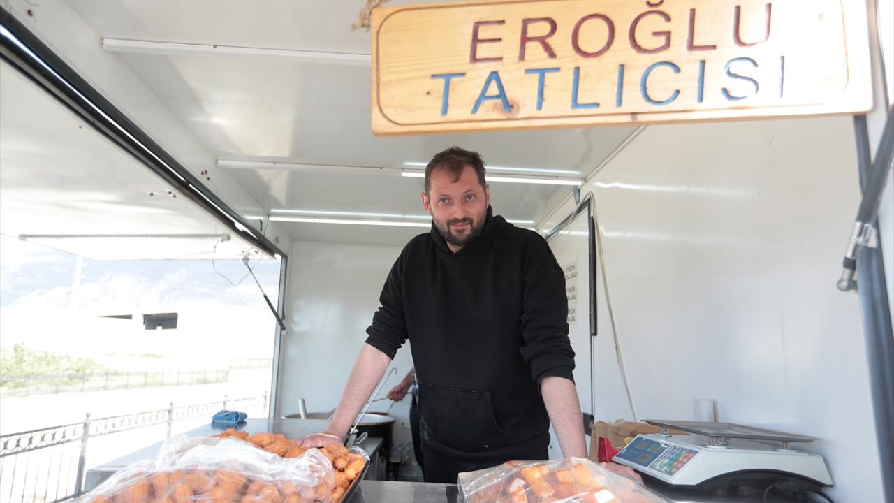 Araçlardan birini yıkılan dükkanın enkazının kaldırıldığı boş alana, diğerini de sanayi sitesi civarına getiren Eroğlu, müşebbek (halka tatlı), taş kadayıf, lokma, tulumba, kabak, Şam tatlısı ve şekerpare gibi şerbetli lezzetler üreterek satışa sunuyor.