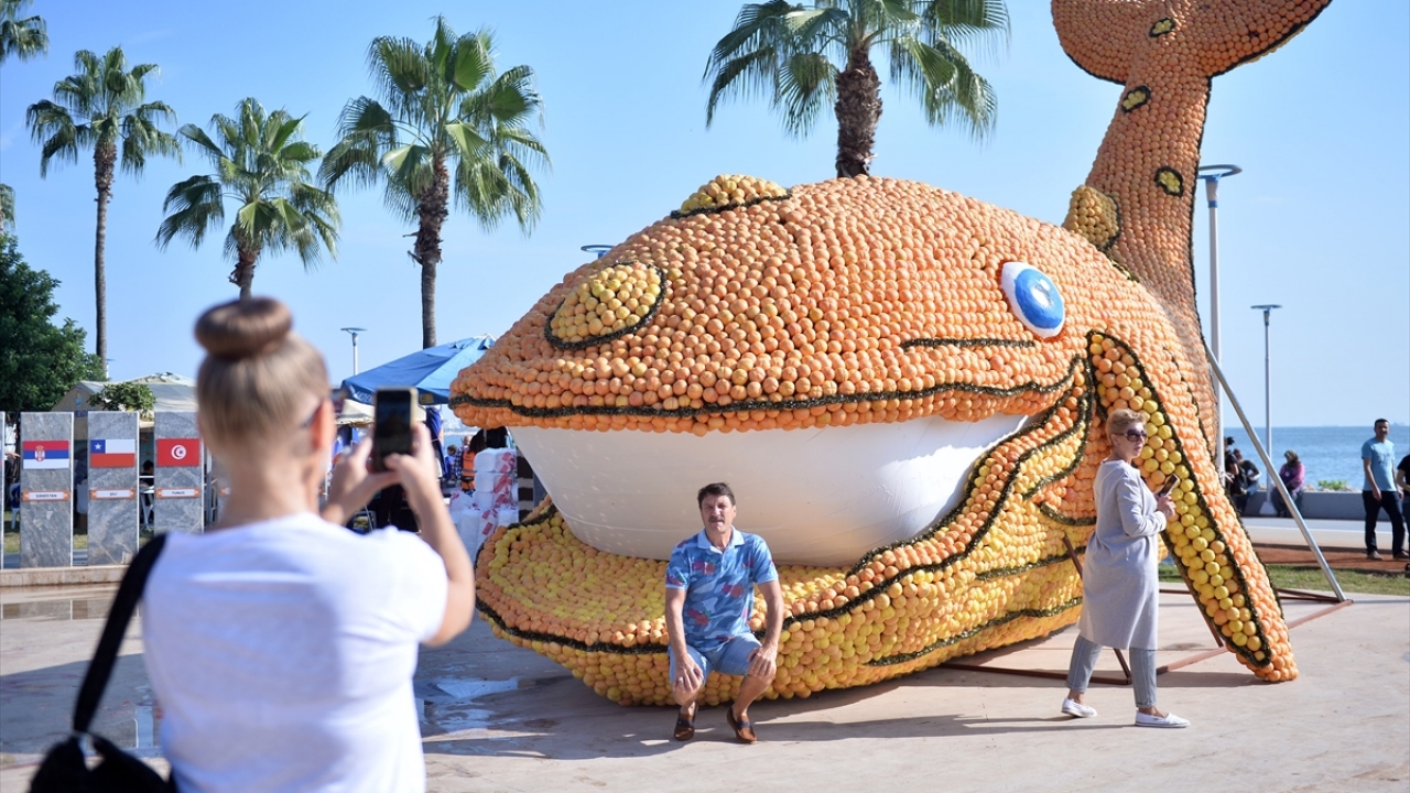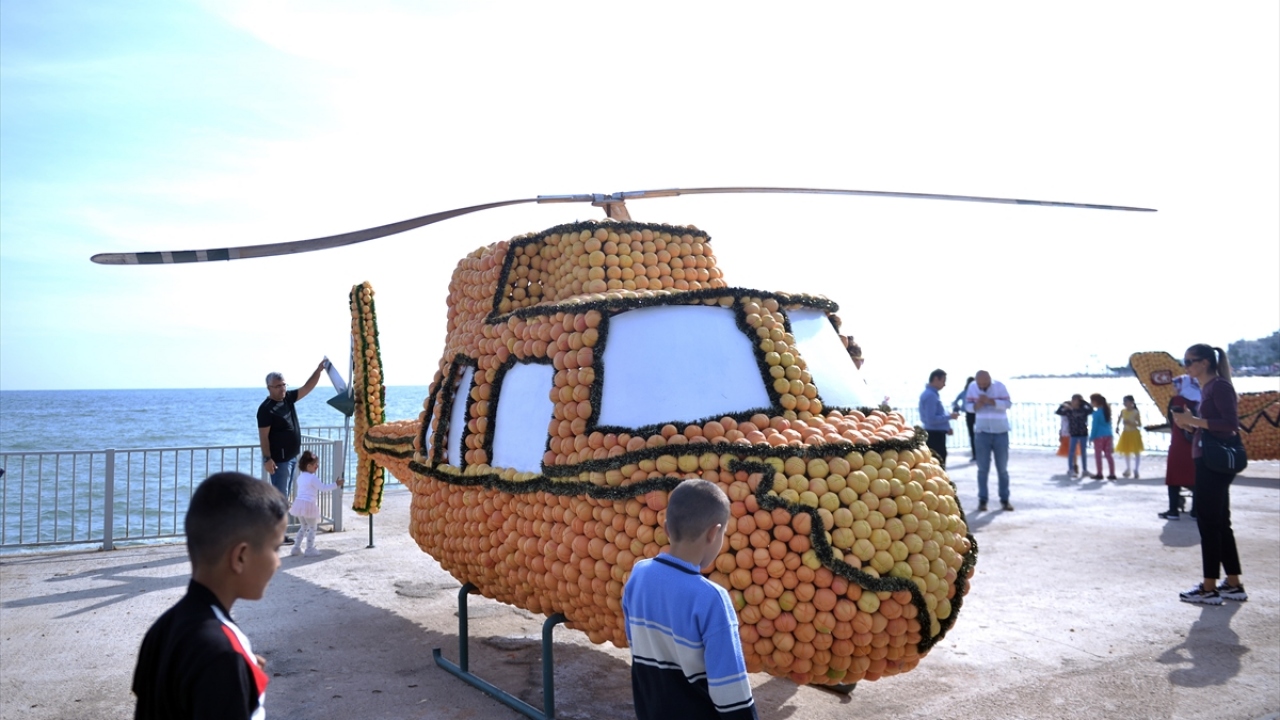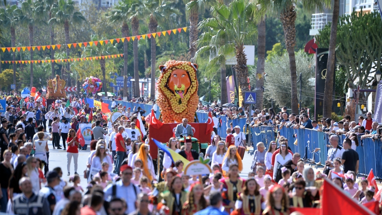 Kortejde, 50 tondan fazla narenciye kullanılarak yapılan aslan, fil, motosiklet, portakal, limon, gitar gibi 10 devasa figür de yer aldı.