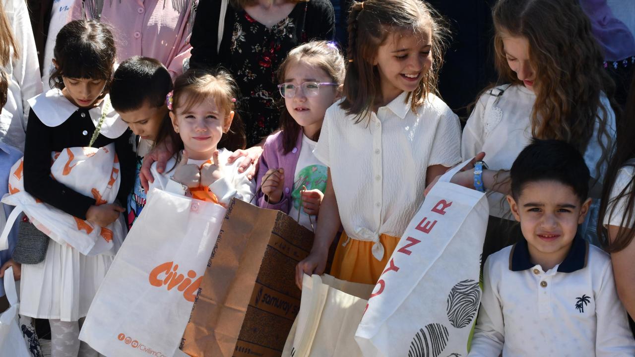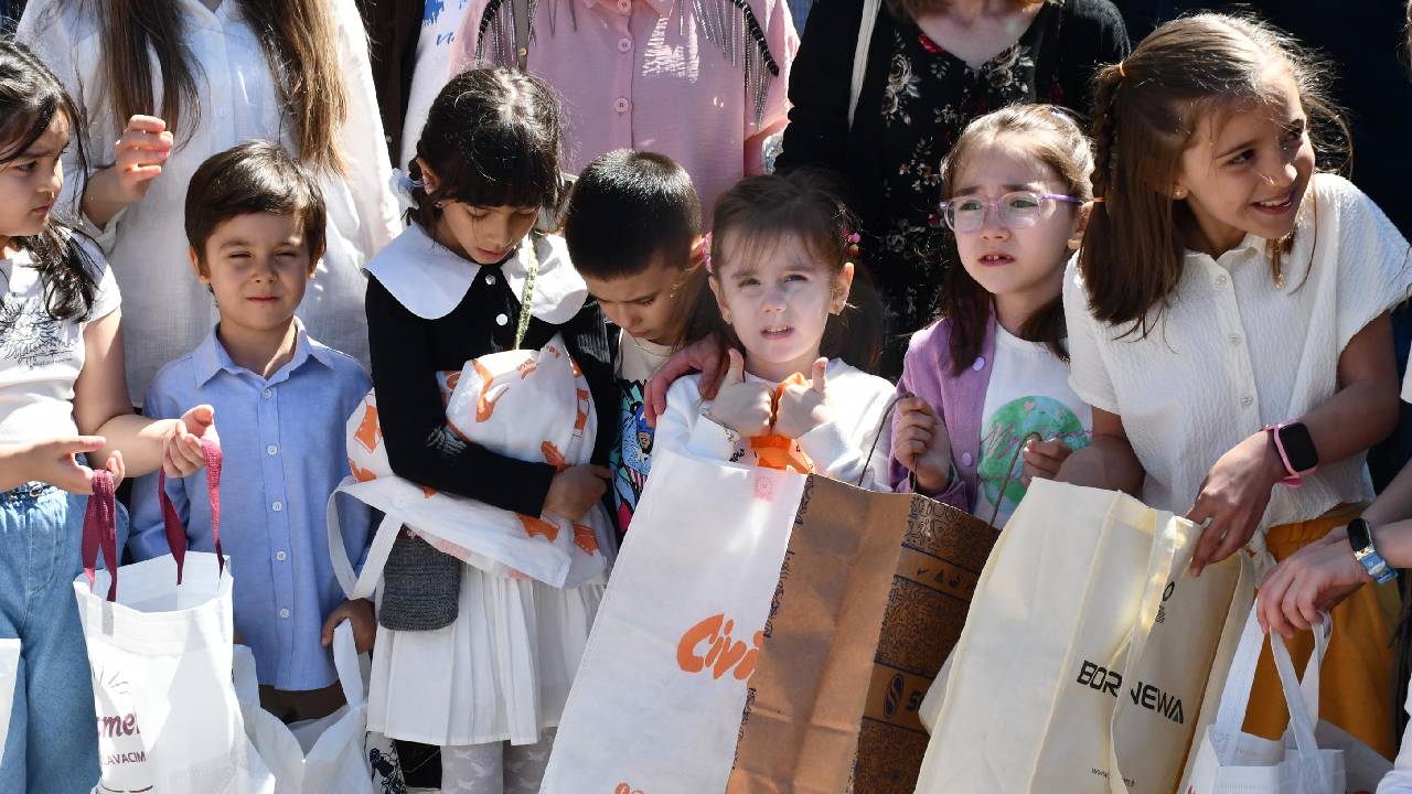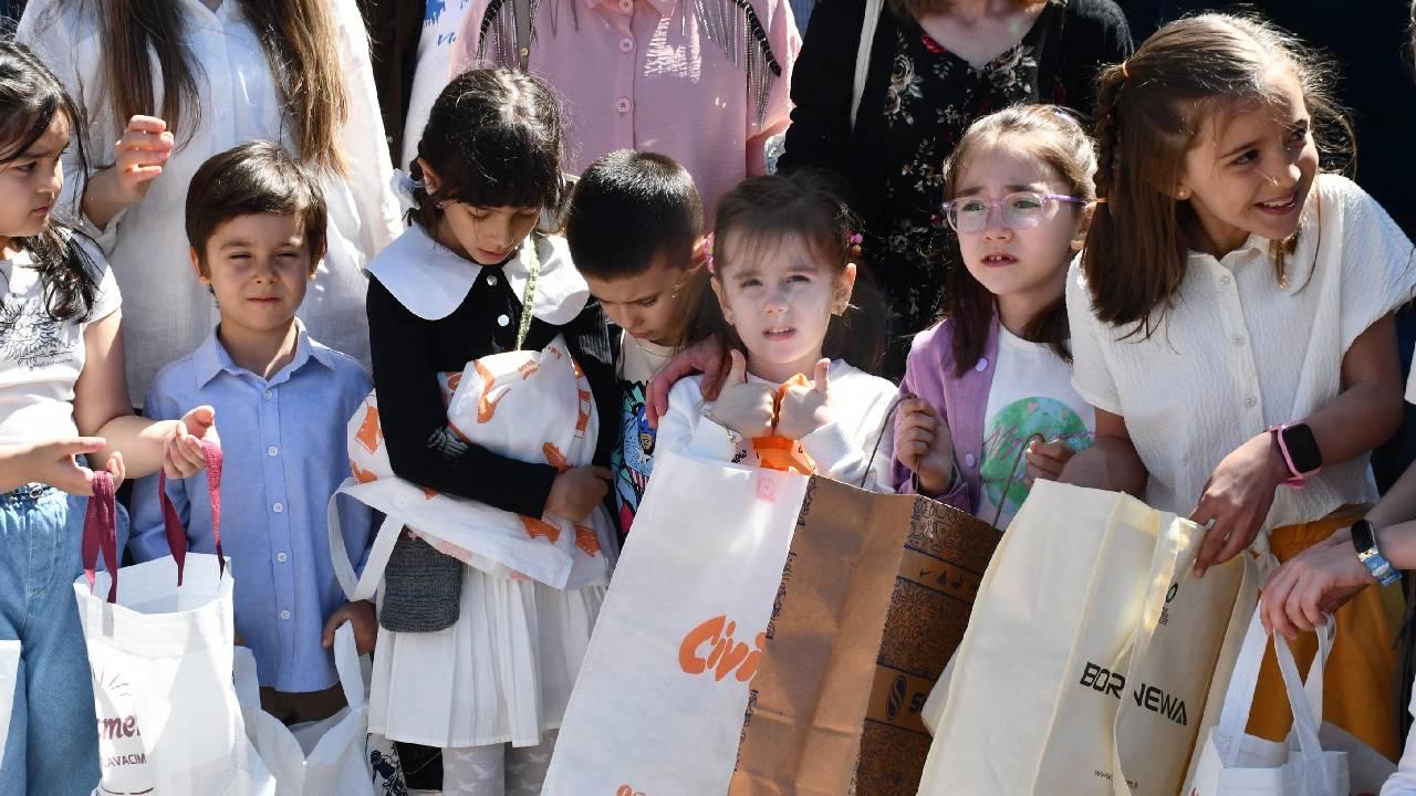 Namazın ardından cami bahçesinde ellerindeki torbalarla bekleyen çocuklara hediyeler dağıtıldı.