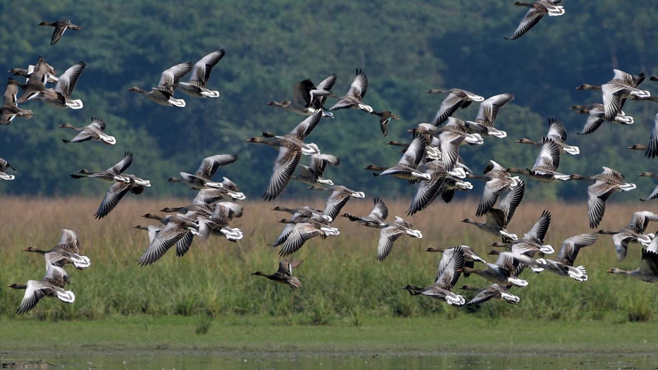 6 Kasım 2022`de Hindistan`ın Assam Eyaletinde bulunan Morigaon bölgesindeki Pobitora Yaban Hayatı Koruma Alanındaki göçmen kuşlar görüntülendi. (Arşiv)