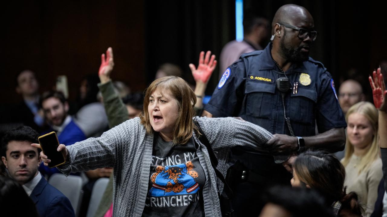Ellerinde savaş karşıtı pankartlarla “Gazze halkına yönelik soykırımı desteklemeyi bırakın”, “Gazze’de katliamı durdurun”, “Gazze’de çocukları kurtarın” ve “Şimdi ateşkes” şeklinde ayağa kalkarak slogan atan protestocular, Kongre polisince salondan çıkarıldı.