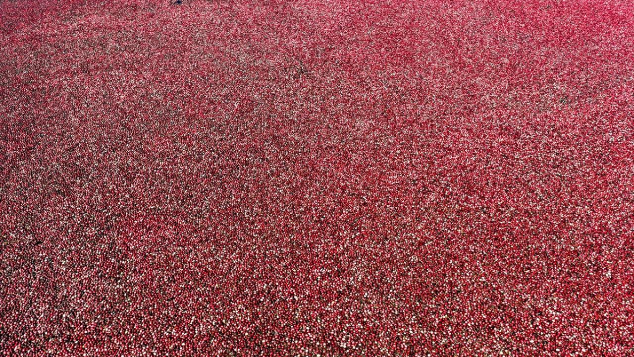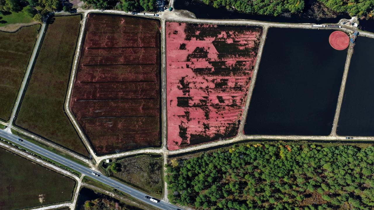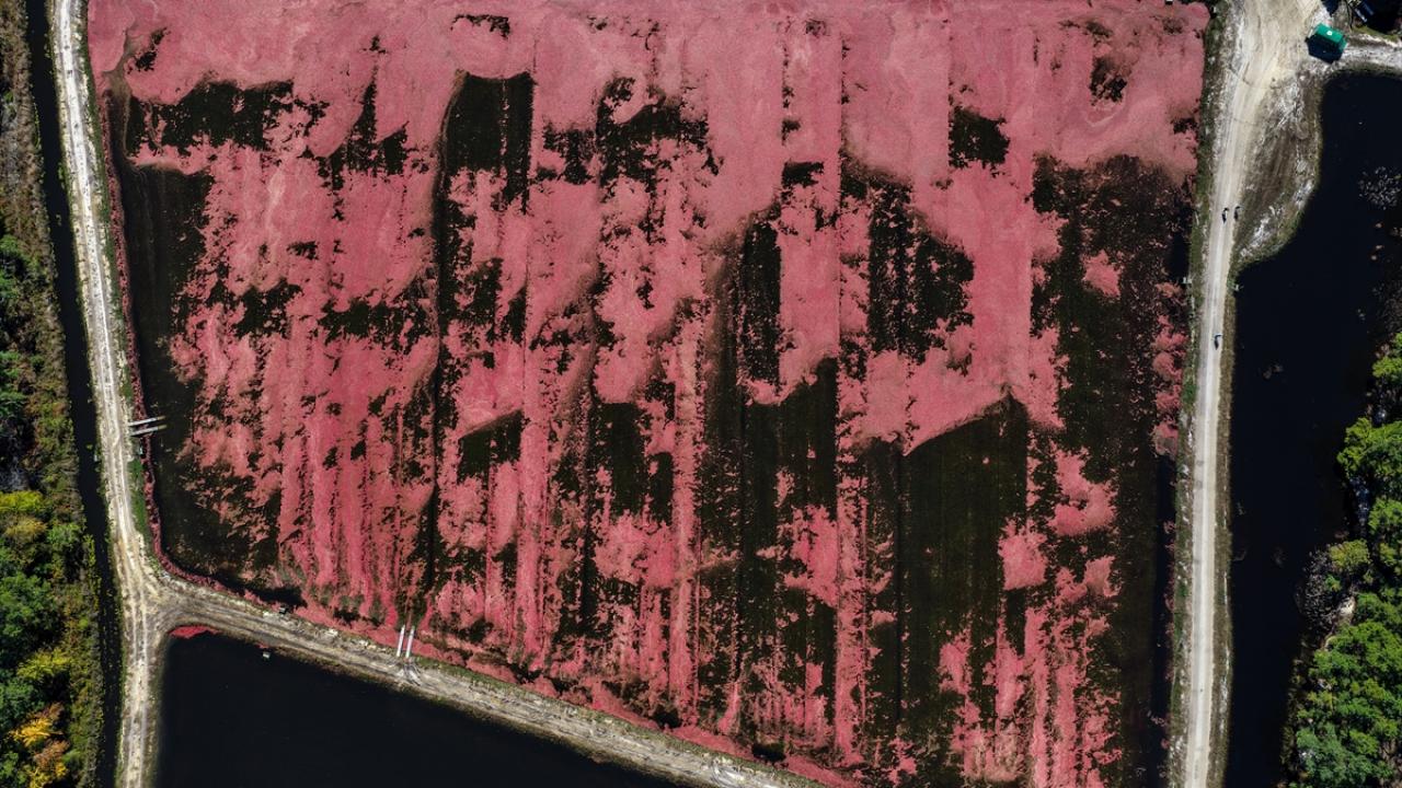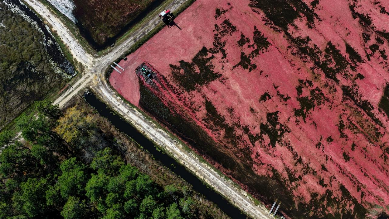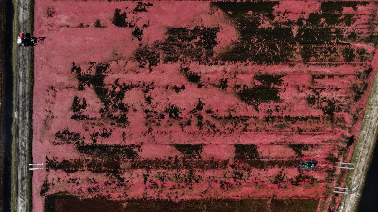 Pine Island Çiftliği’nde çalışan işçiler, suyla doldurulmuş tarlalarda parlak kırmızı meyveleri topladı.