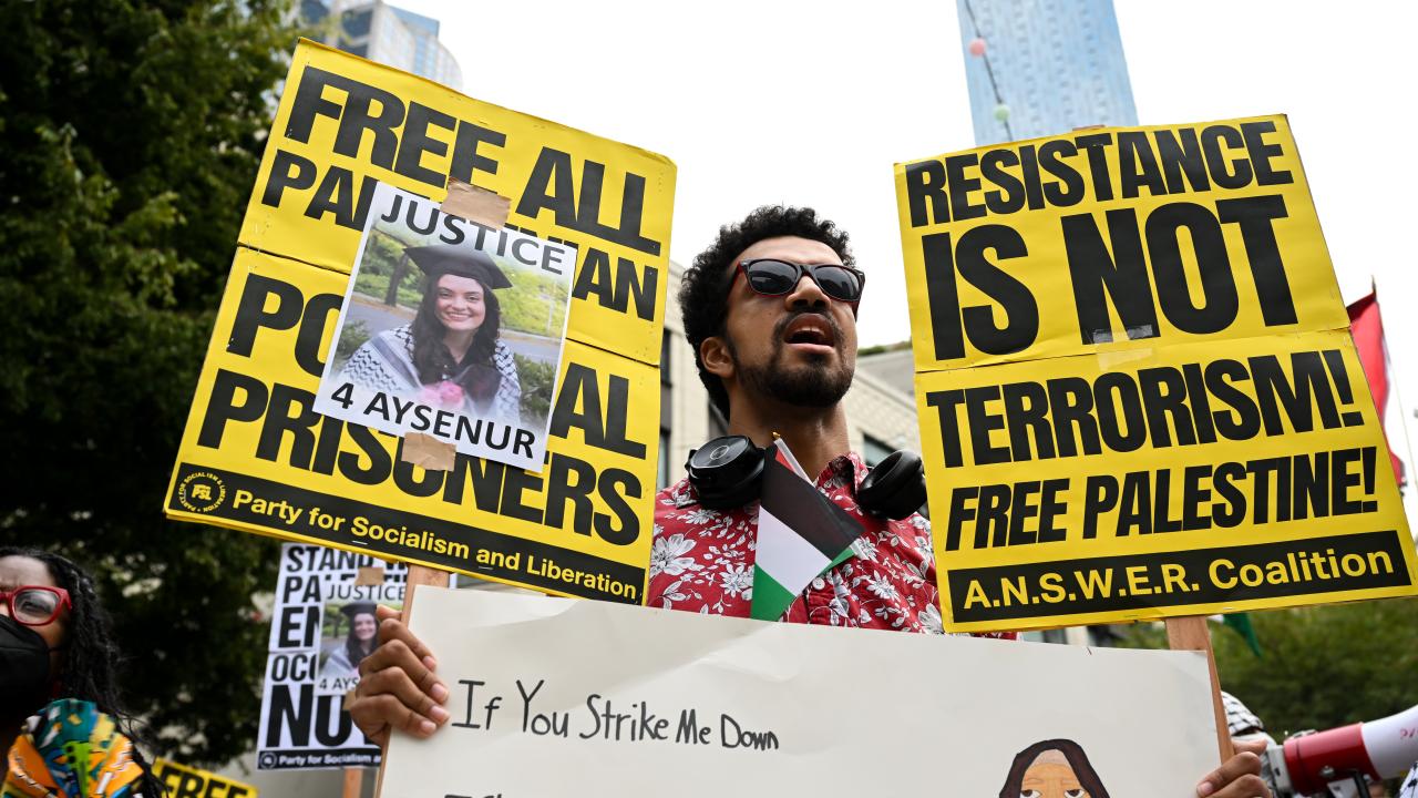 Amerika Birleşik Devletleri'nin Washington eyaletinin Seattle kentindeki Westlake Park'ta toplanan yüzlerce Filistin yanlısı gösterici, 26 yaşındaki Türk asıllı Amerikalı kadın Ayşenur Ezgi Eygi'nin Nablus'ta İsrail askerleri tarafından öldürülmesinin ardından İsrail'i protesto etmek için sokaklarda yürüdü.