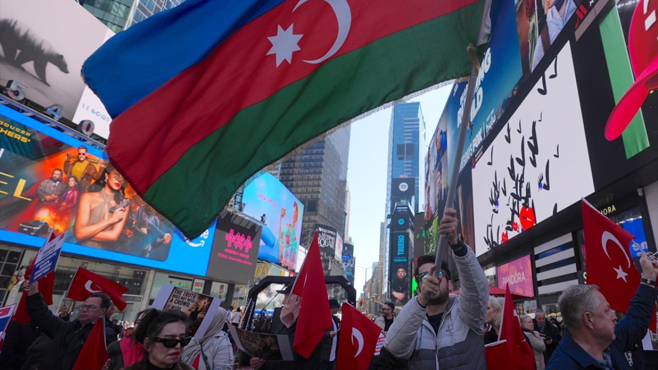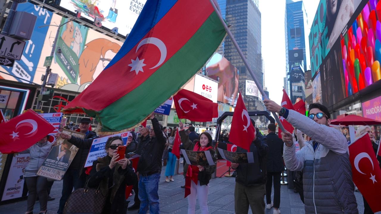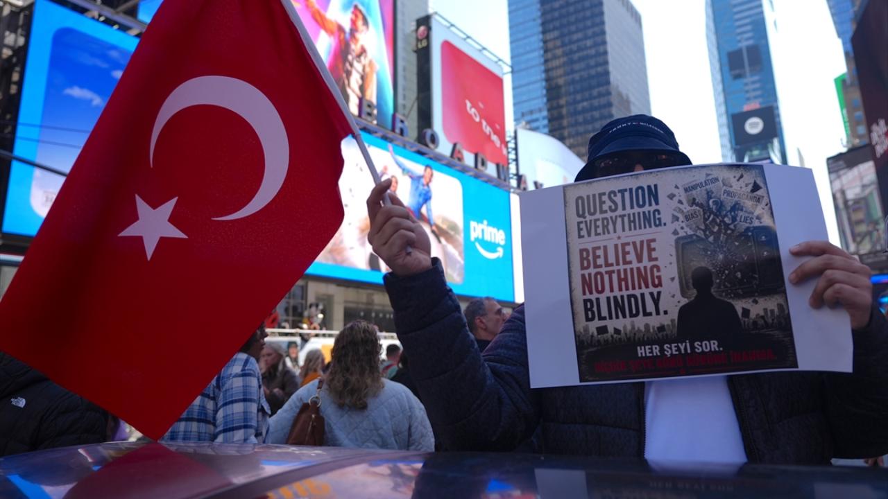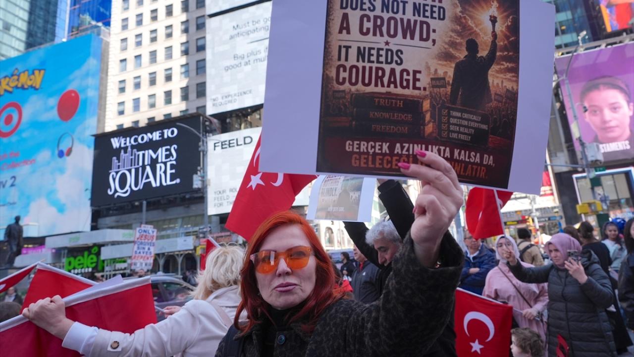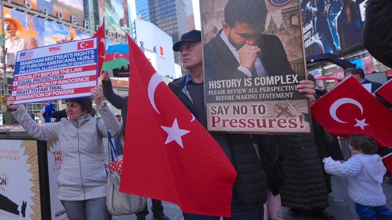 New York`un Times Meydanı`nda birçok Türk derneğinin destek verdiği eylemde, Mamdani`nin 24 Nisan`da sosyal medya hesabından yaptığı paylaşım protesto edildi.