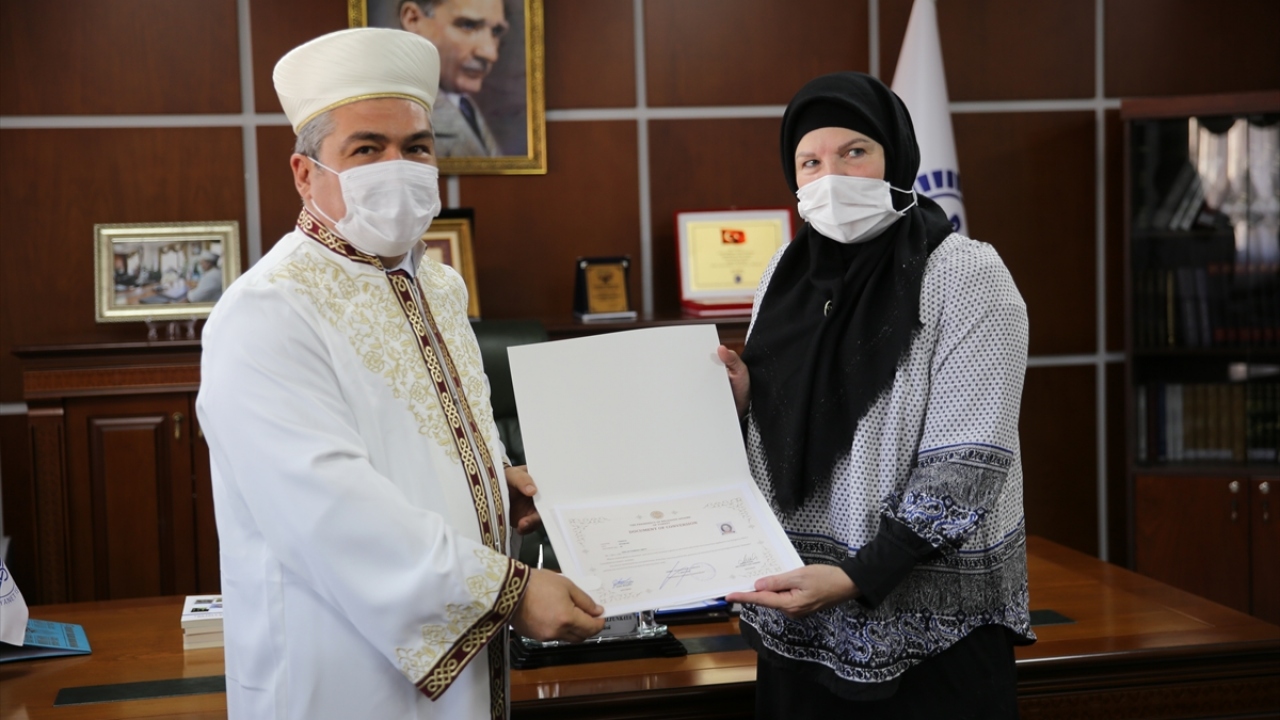 Altunkaya tarafından ihtida belgesi verilen çifte, İngilizce Kur`an-ı Kerim meali ve peygamberlerin hayatını anlatan kitap hediye edildi.