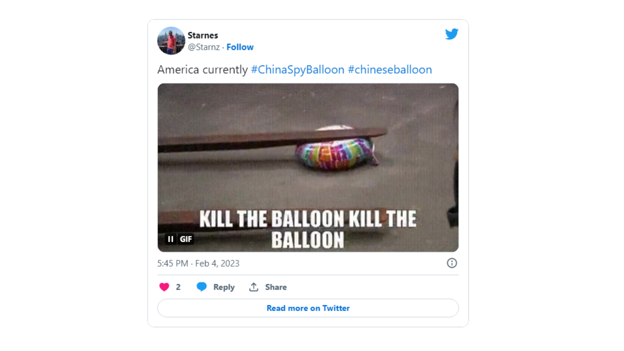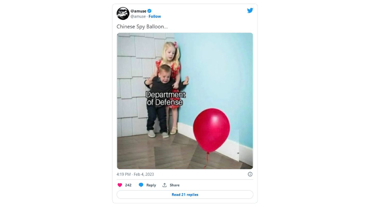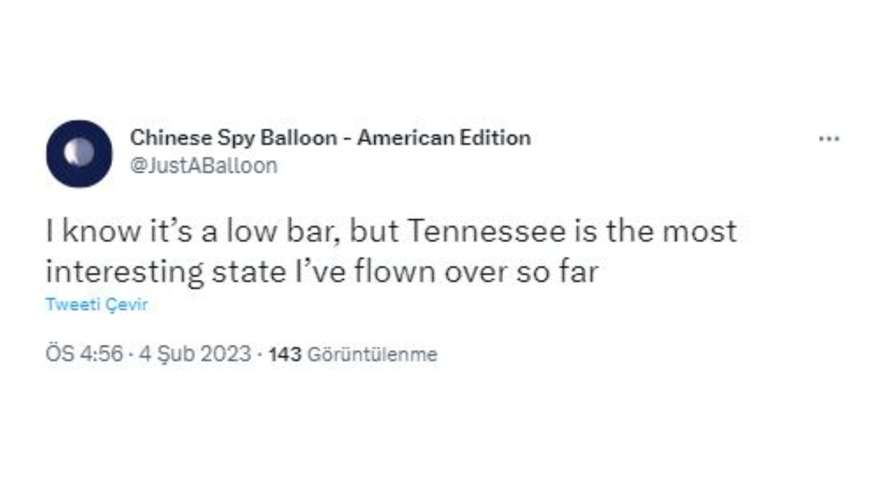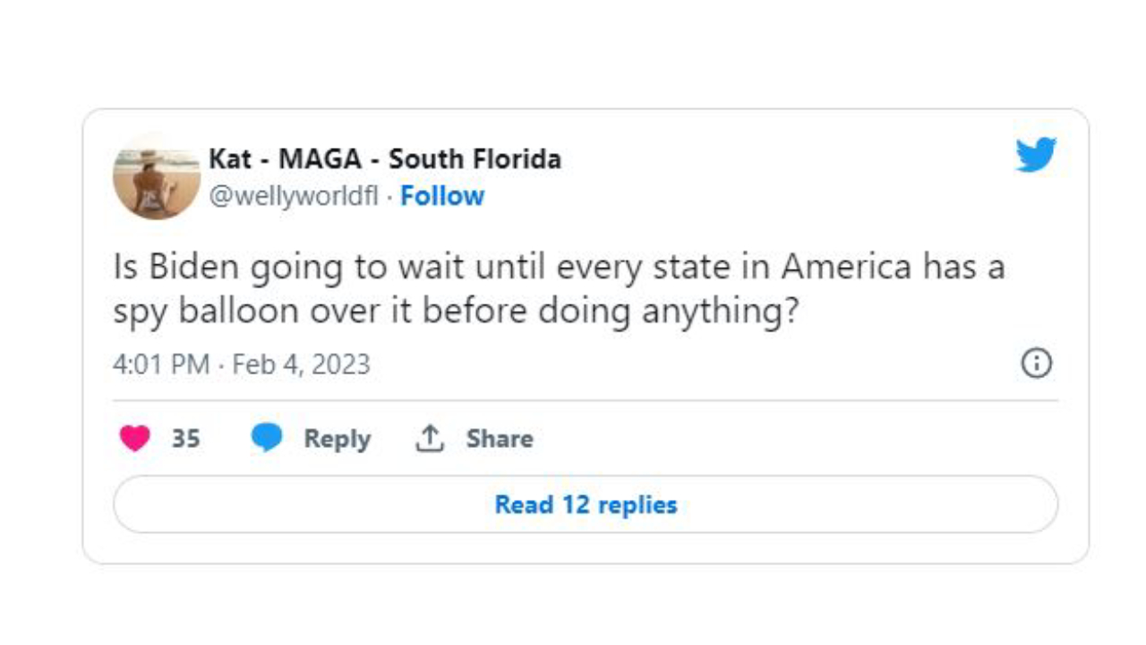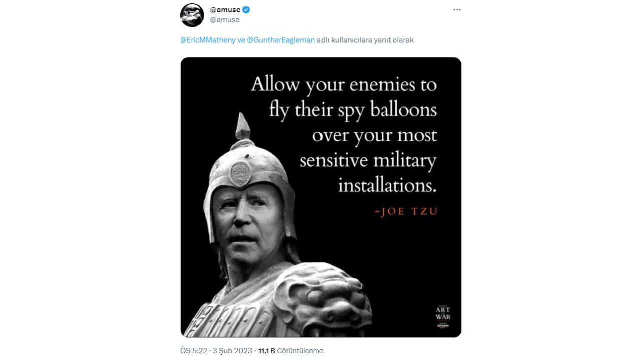 ABD Savunma Bakanlığı, Çin’e ait bir yüksek irtifalı istihbarat balonunun ABD üzerinde uçuş yaptığını duyurdu. Taraflardan açıklamalar geldi ancak ABD'liler tepkileri yetersiz buldu. Halk, sosyal medya üzerinden hükümetle dalga geçerek Başkan Joe Biden'a yüklendi.