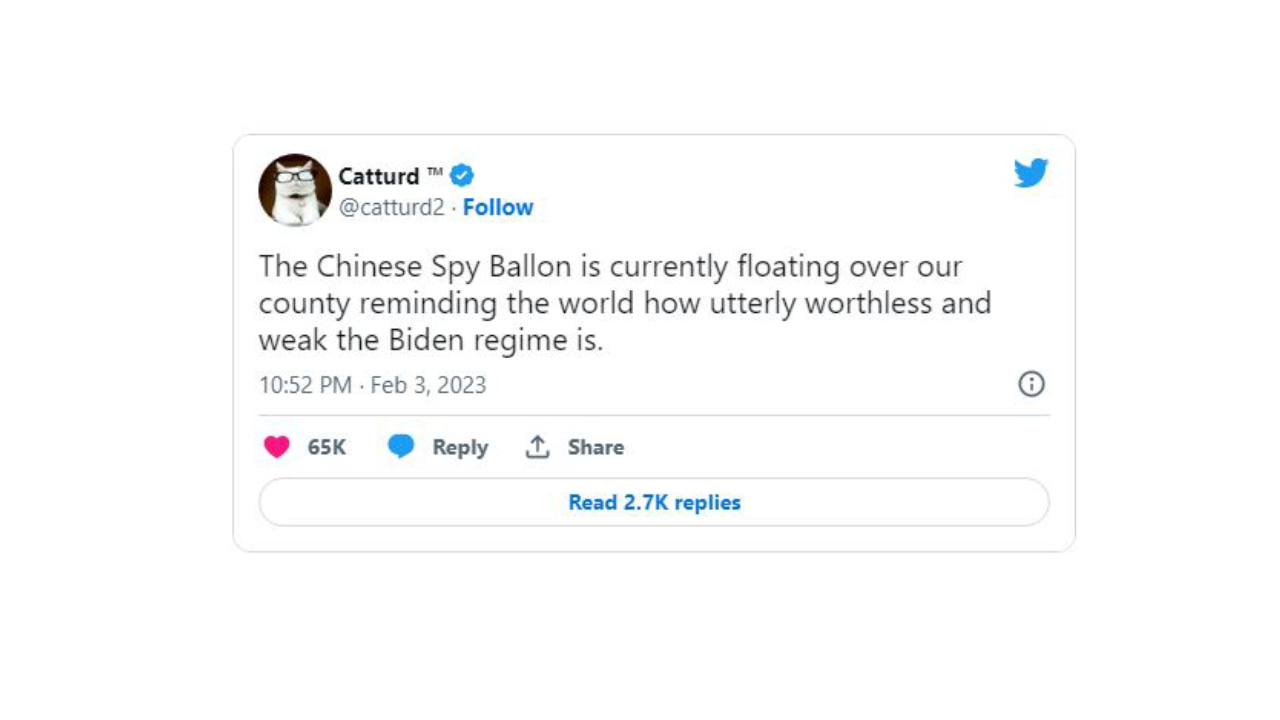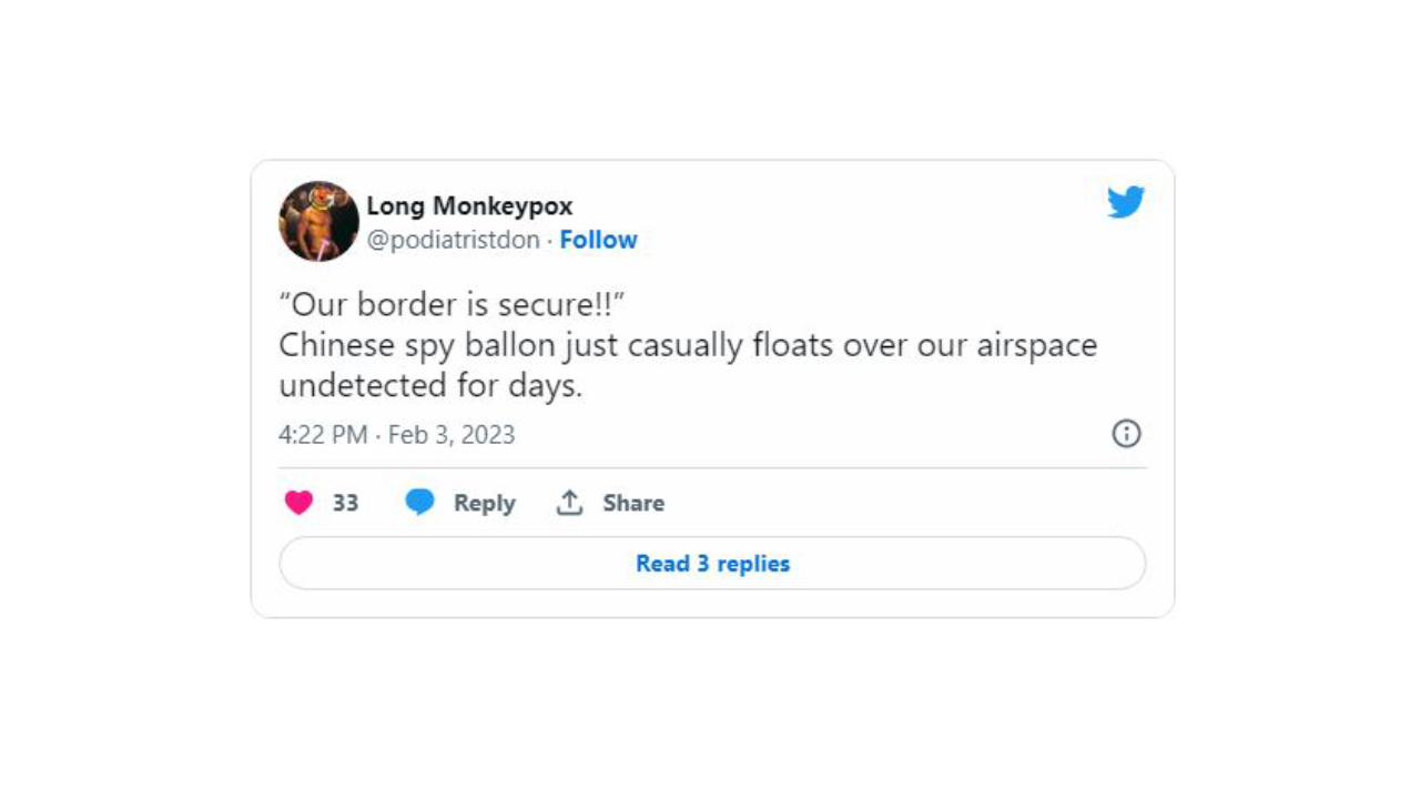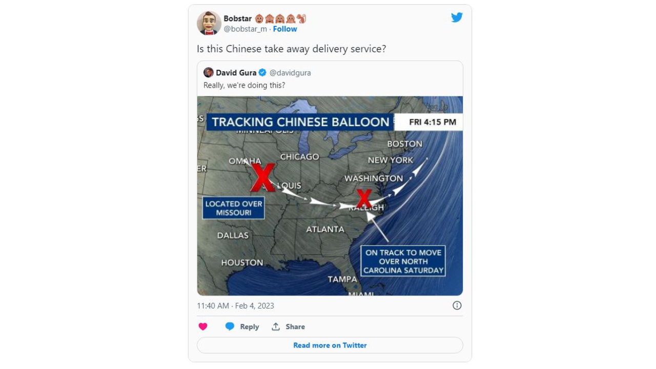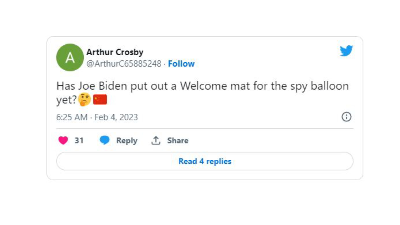 ABD Savunma Bakanlığı, Çin’e ait bir yüksek irtifalı istihbarat balonunun ABD üzerinde uçuş yaptığını duyurdu. Taraflardan açıklamalar geldi ancak ABD'liler tepkileri yetersiz buldu. Halk, sosyal medya üzerinden hükümetle dalga geçerek Başkan Joe Biden'a yüklendi.