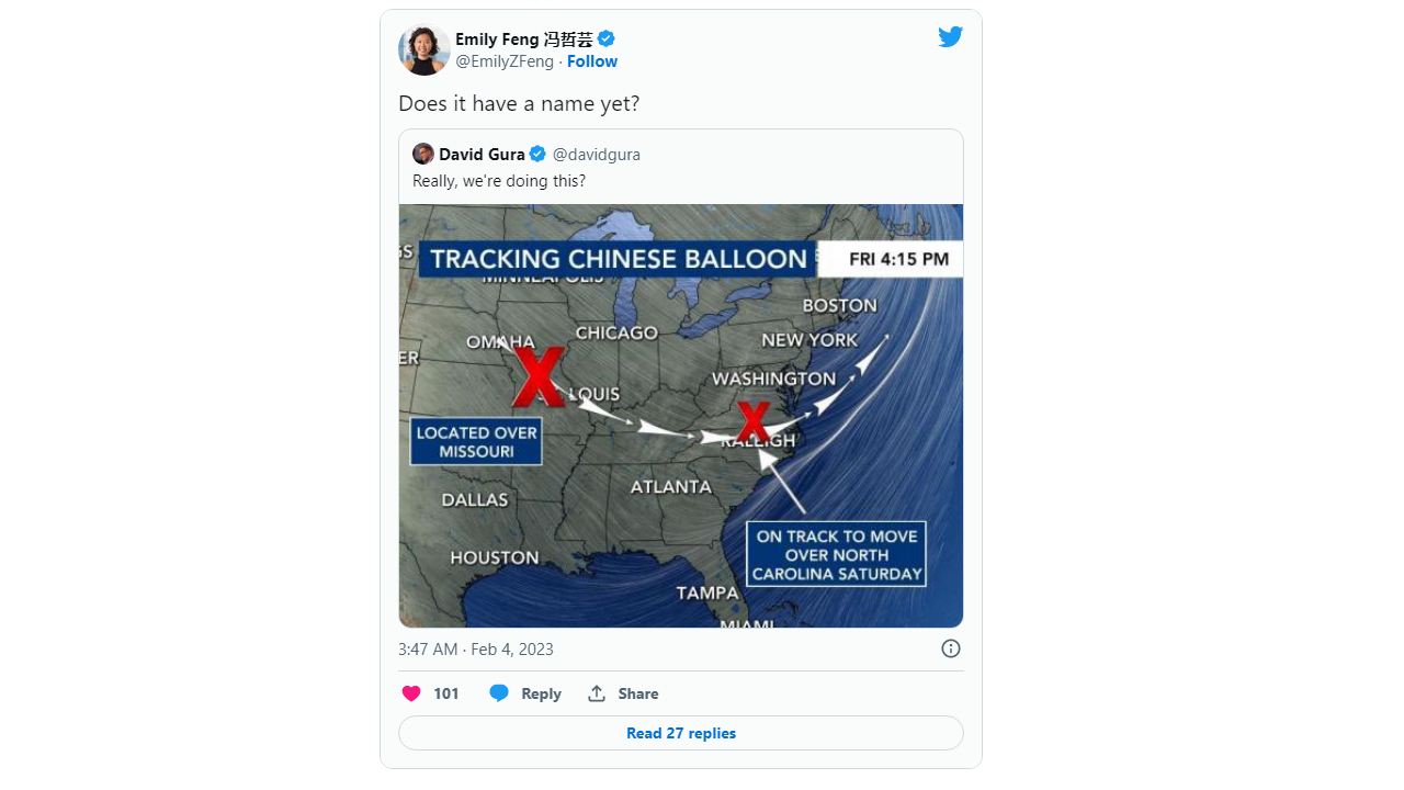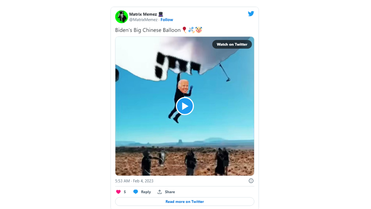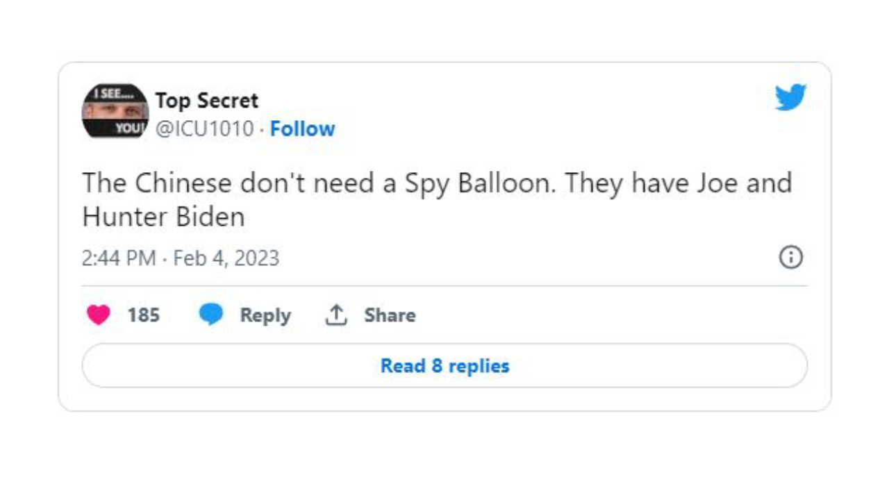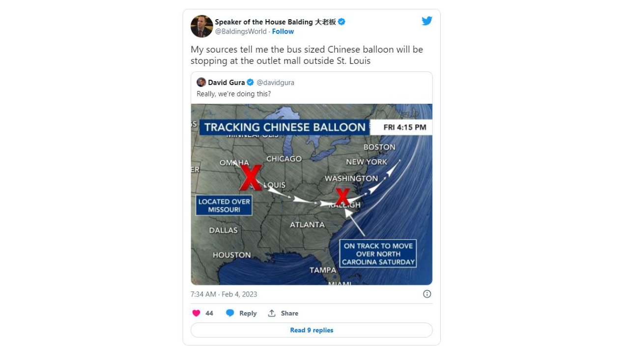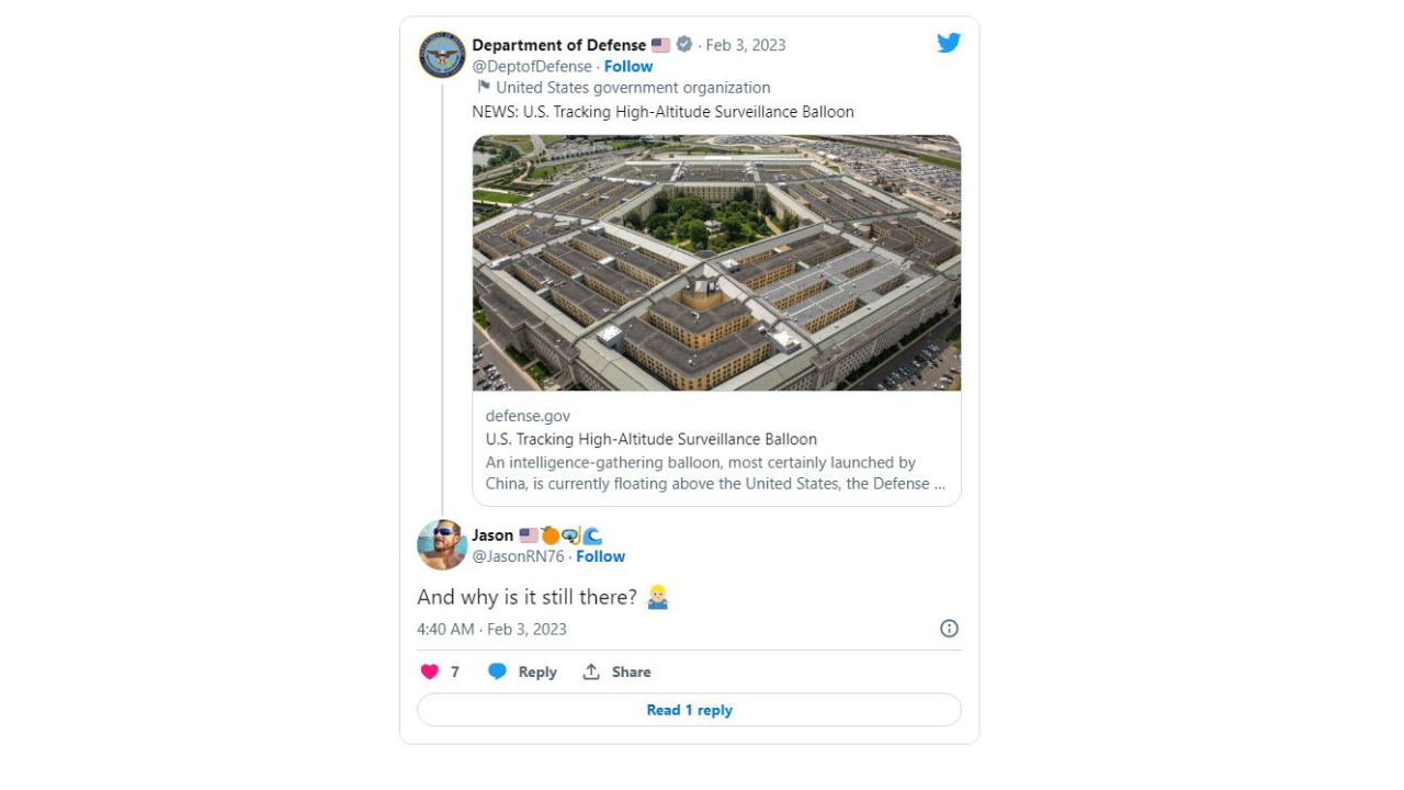 ABD Savunma Bakanlığı, Çin’e ait bir yüksek irtifalı istihbarat balonunun ABD üzerinde uçuş yaptığını duyurdu. Taraflardan açıklamalar geldi ancak ABD'liler tepkileri yetersiz buldu. Halk, sosyal medya üzerinden hükümetle dalga geçerek Başkan Joe Biden'a yüklendi.