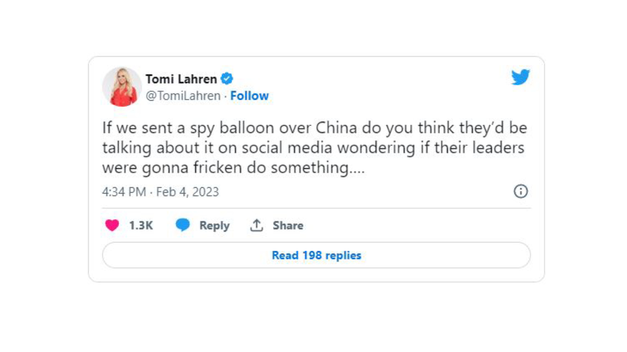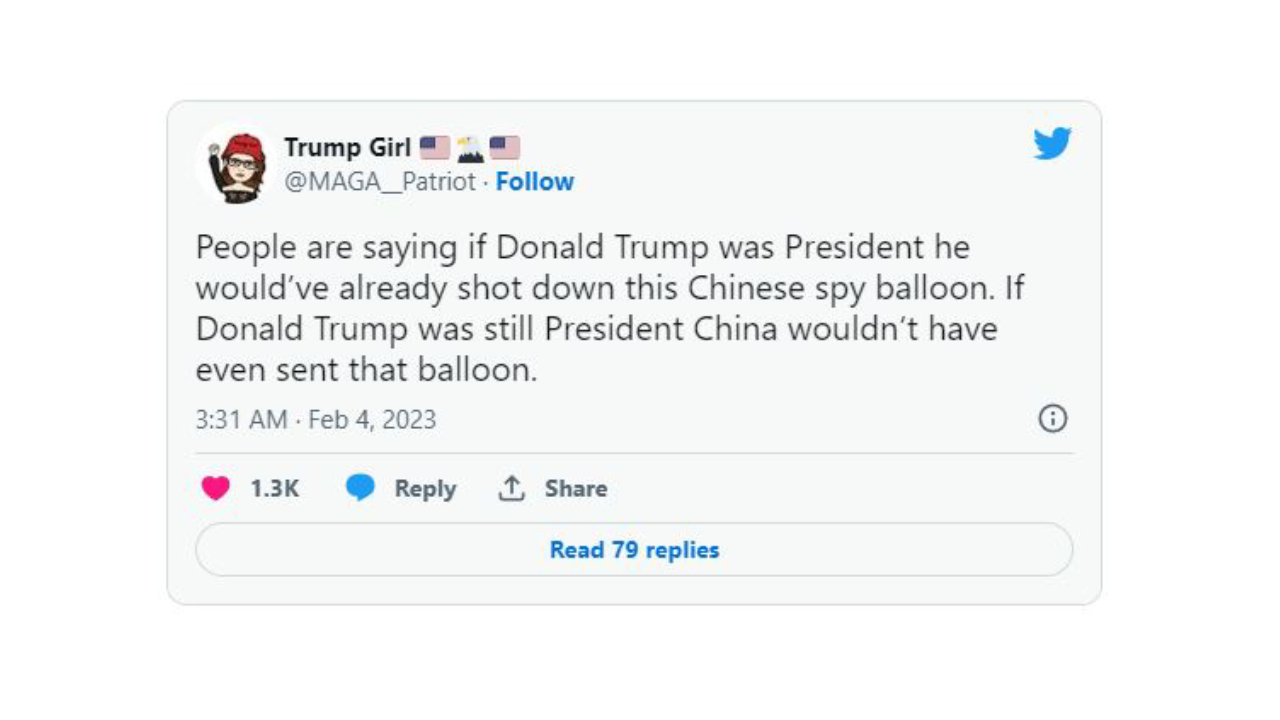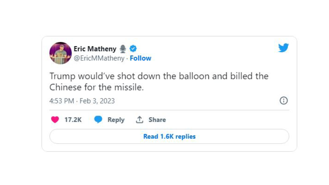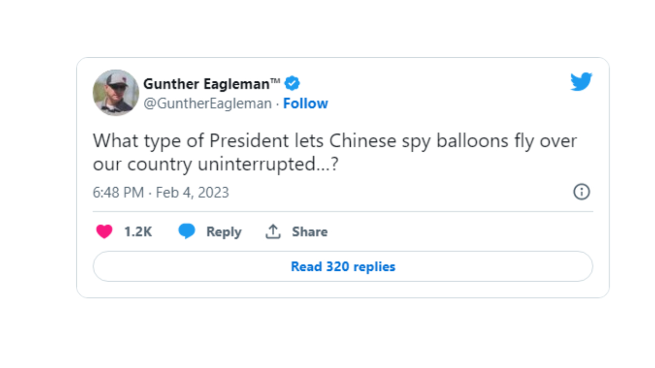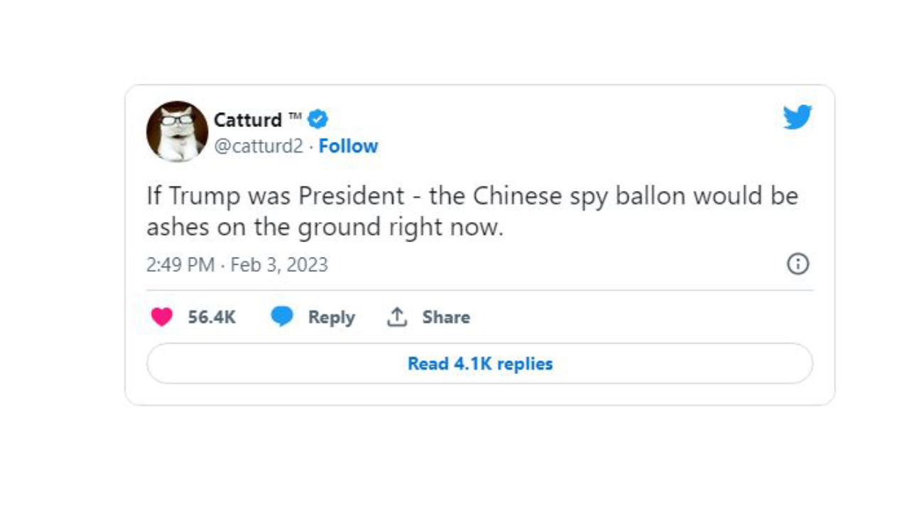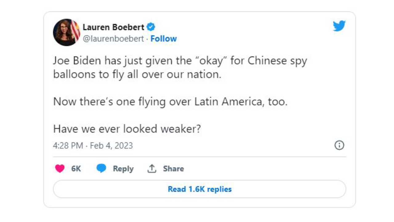 ("Joe Biden, Çin casus balonlarının ülkemizin üzerinde uçmasına onay verdi. Şimdi bir tane de Latin Amerika üzerinde uçuyor. Nasıl daha zayıf gözükebilirdik?"