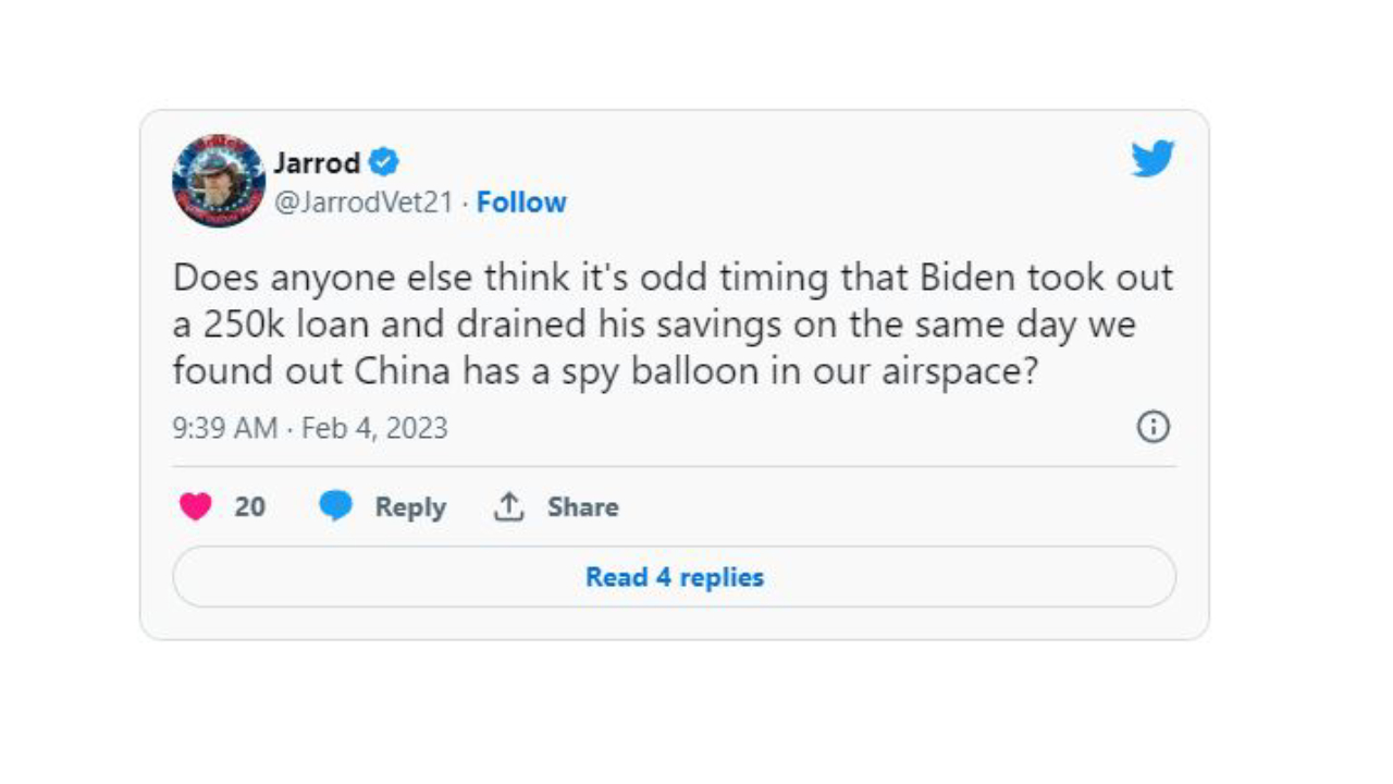 ("Biden`ın Çin`in hava sahamızda bir casus balonu olduğunu öğrendiğimiz gün 250 bin kredi alıp birikimlerini tüketmesinin tuhaf bir zamanlama olduğunu düşünen başka kimse var mı?")