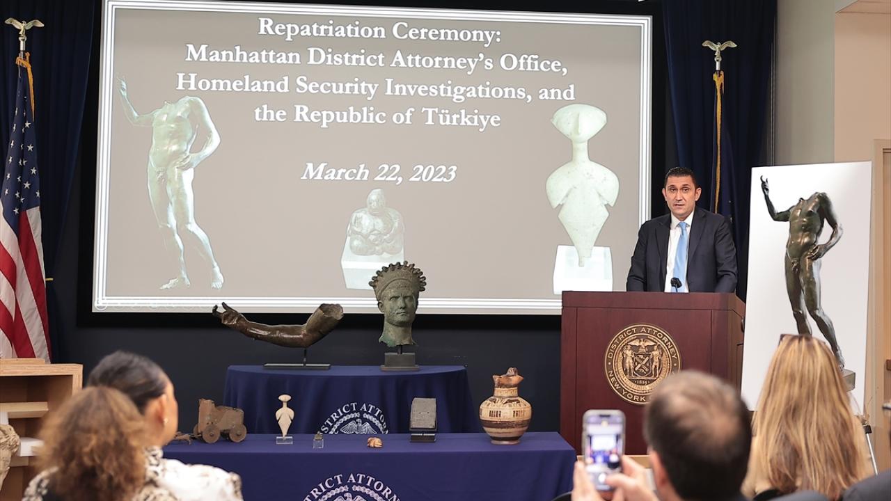 Özgür, "Kültürel ve tarihi eser kaçakçılığıyla mücadele alanında son yıllarda yakaladığımız işbirliğini takdirle karşılıyorum. Manhattan Bölge Savcılığı, İç Güvenlik Soruşturmaları ekibi ve Türkiye Cumhuriyeti Kültür ve Turizm Bakanlığı arasında kurulan istikrarlı ve sorunsuz iletişimle verimli sonuçlar elde ediyoruz." diye konuştu.