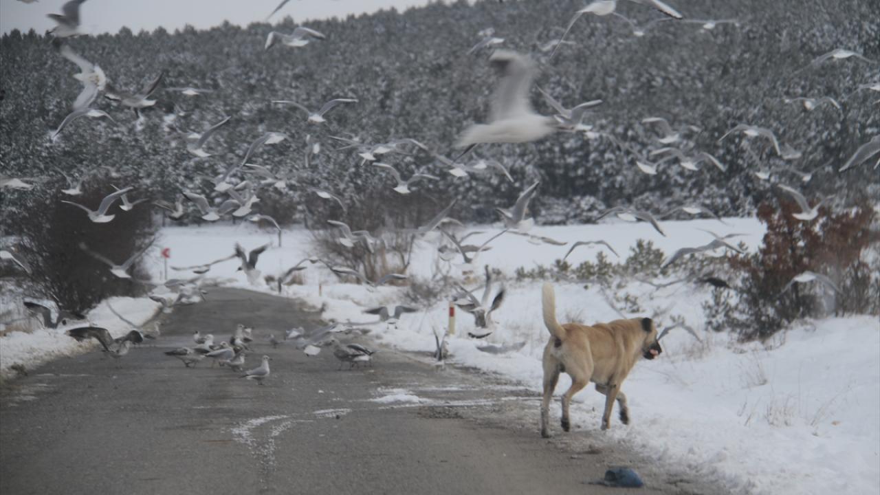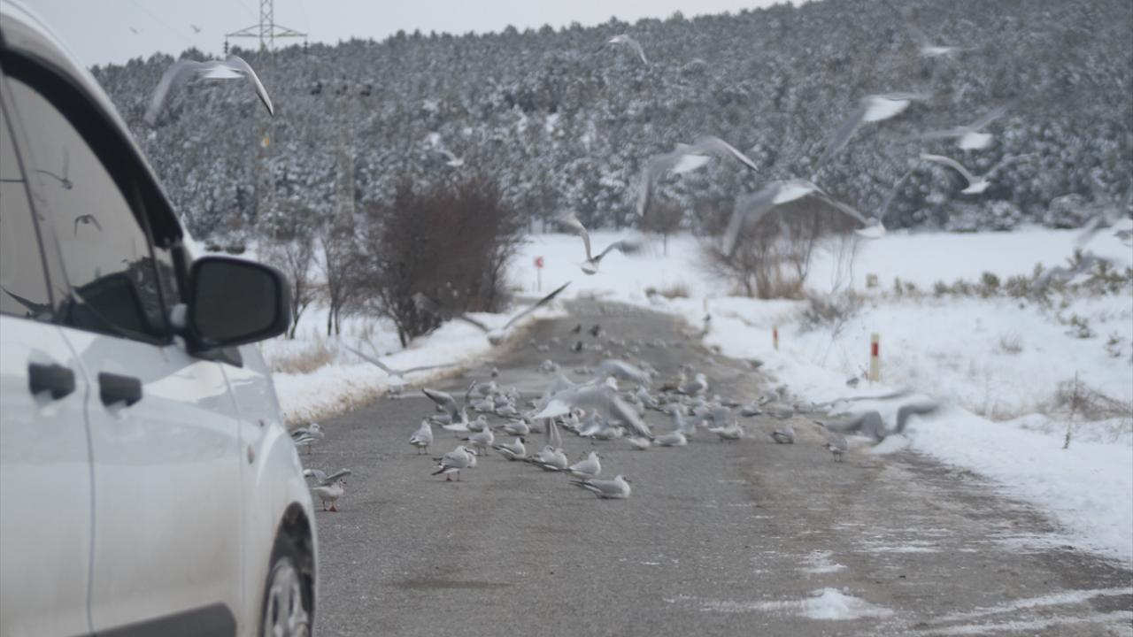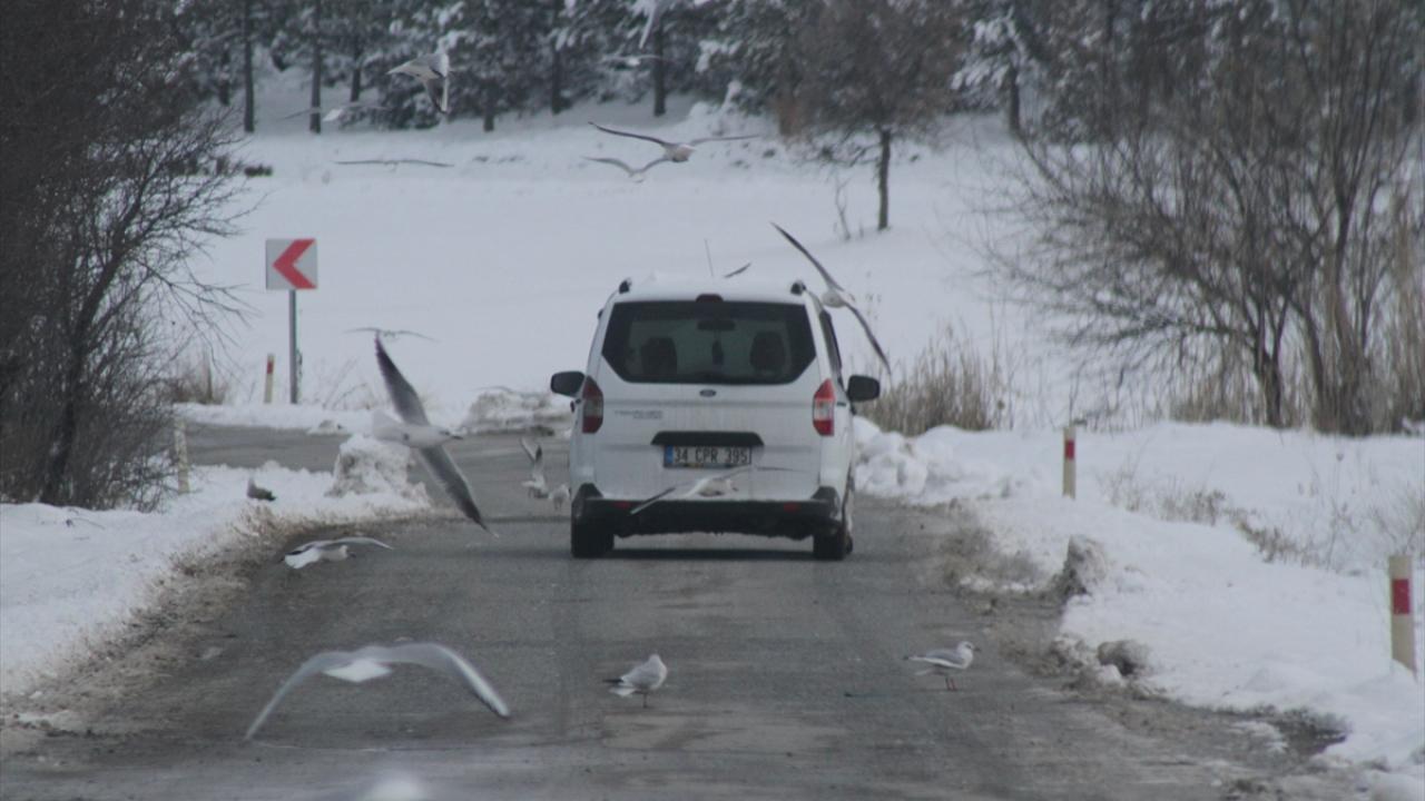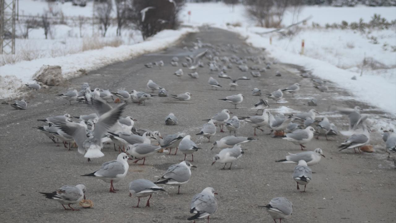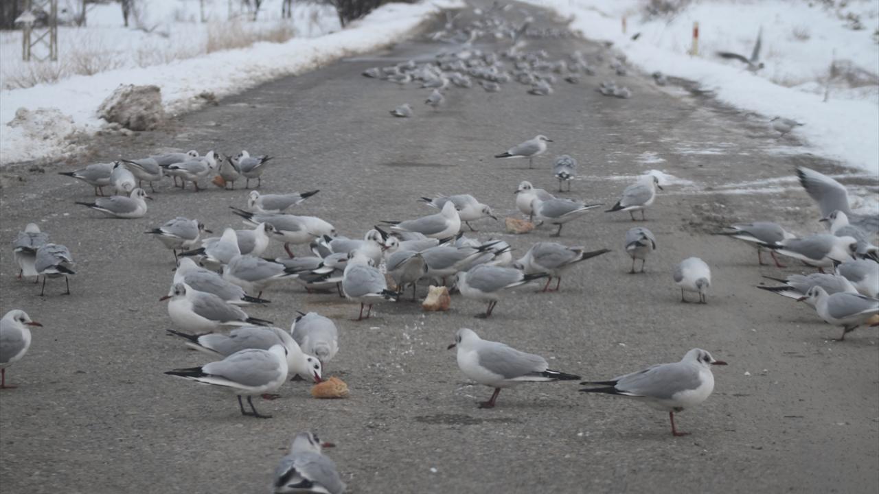 Barınakların yanından geçen asfalt yol üzerine inerek bekleyen ve soğuktan etkilendiği gözlenen çok sayıdaki martı, sürücülerin attığı ekmek parçalarını kapabilmek için birbiriyle yarışıyor.