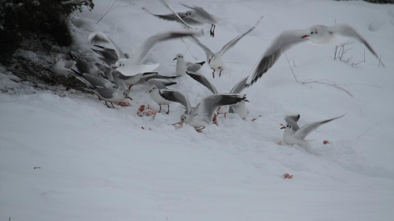 Martı sürüleri, kar örtüsü üzerine bırakılan ekmek parçalarını da kapmak için mücadele verdi.