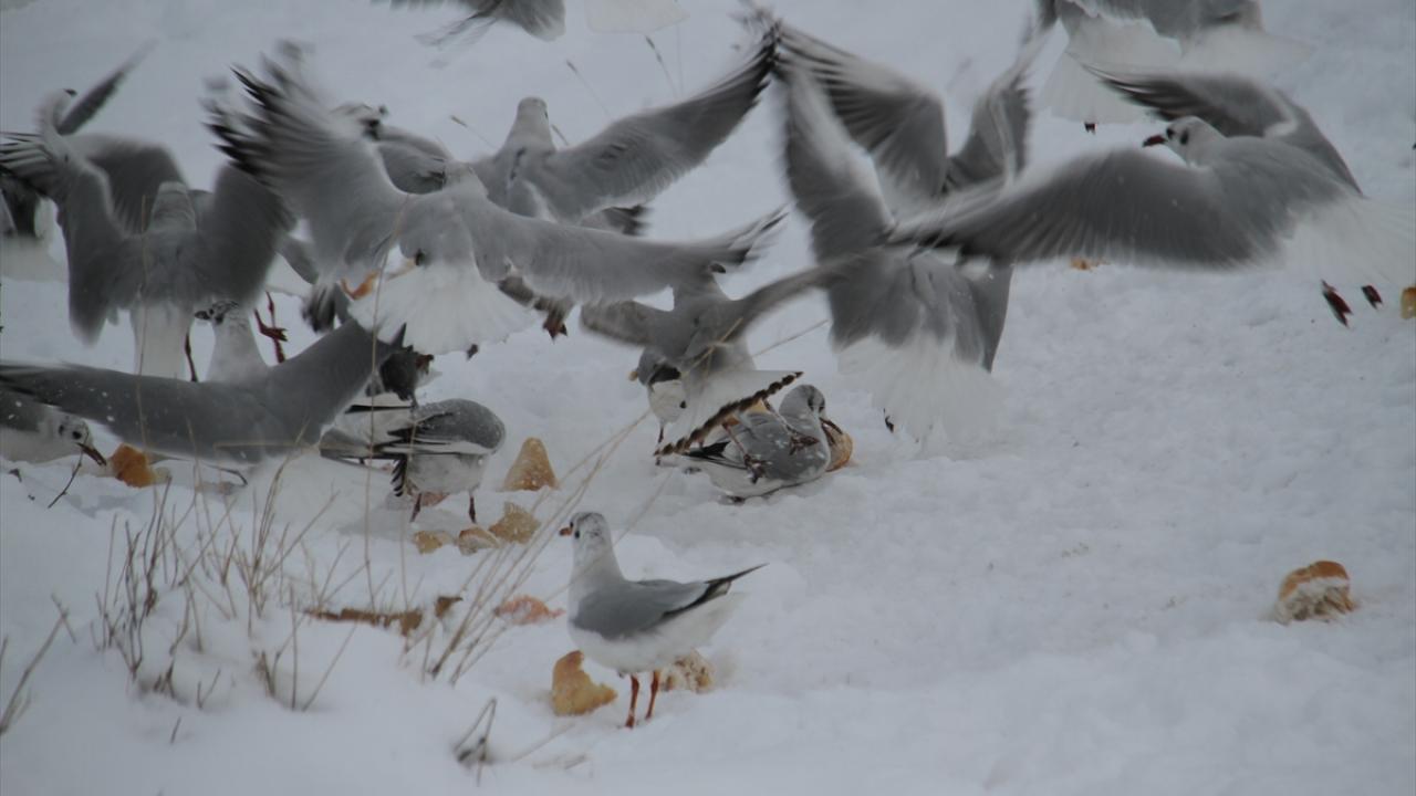 Göl kıyılarında vatandaşların attığı ekmek ve simit parçalarıyla beslediği martı sürüleri, doğal alanların kar örtüsü ile kaplanması üzerine aç kalınca, yiyecek arayışı için farklı alanlara yöneldi.