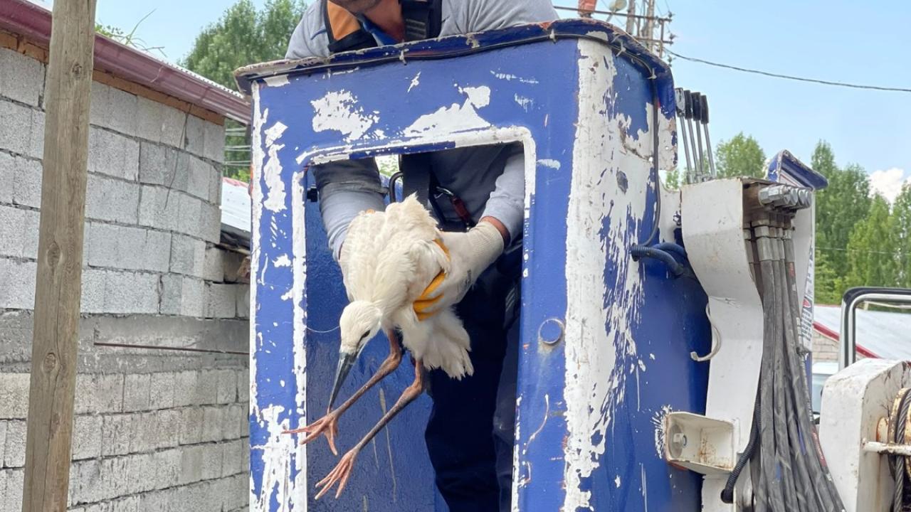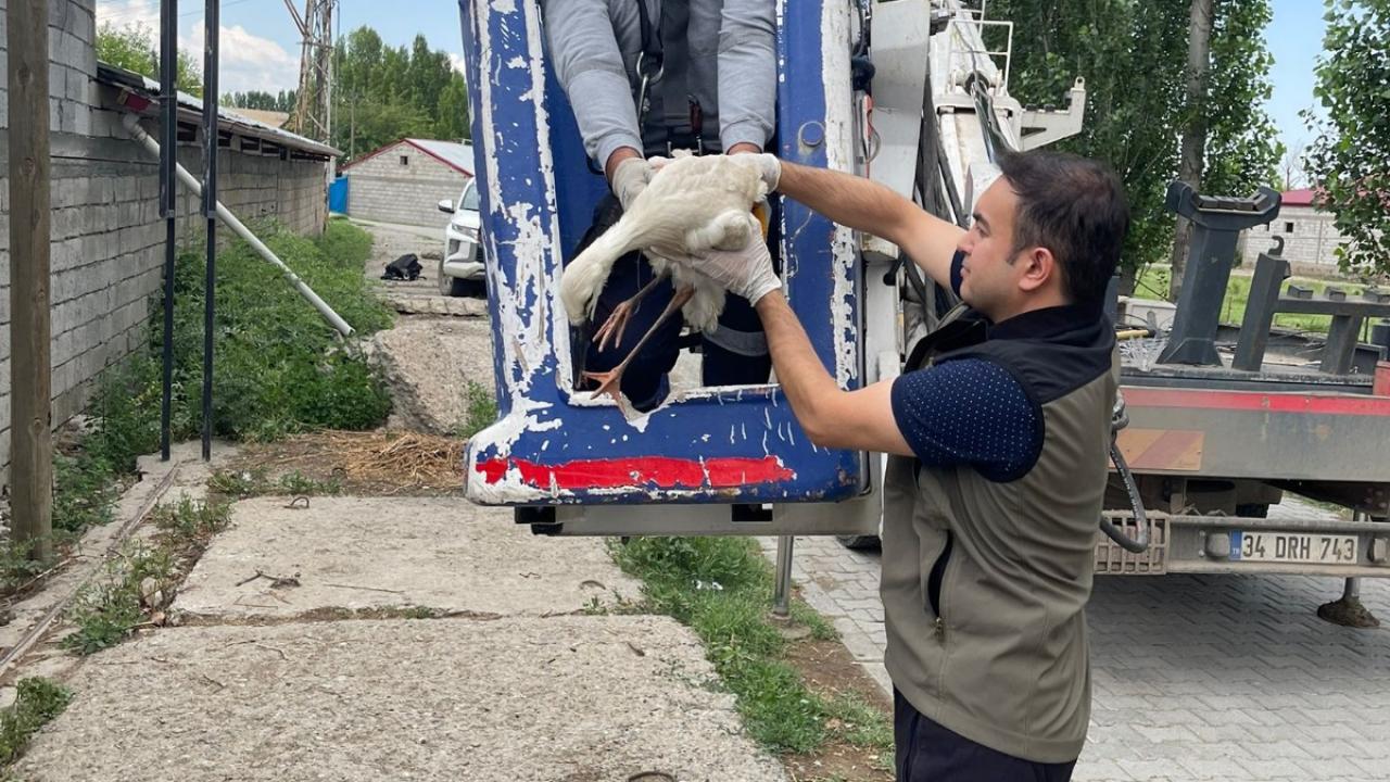 Iğdır'ın Aralık ilçesine bağlı Ramazankent köyünde elektrik direğindeki yuvasında açlıktan bitkin düşen yavru leylek, vinçle alındı.