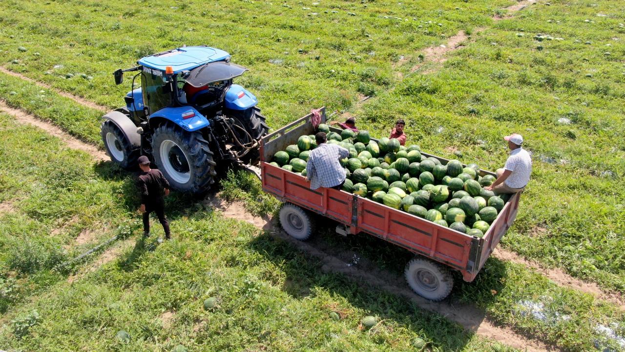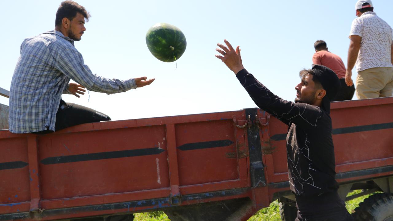 Tarlada bin bir emekle yetiştirilen karpuzlar, `yükleyici` olarak bilinen işçiler tarafından kamyonlara konularak Türkiye`nin dört bir yanına gönderiliyor.