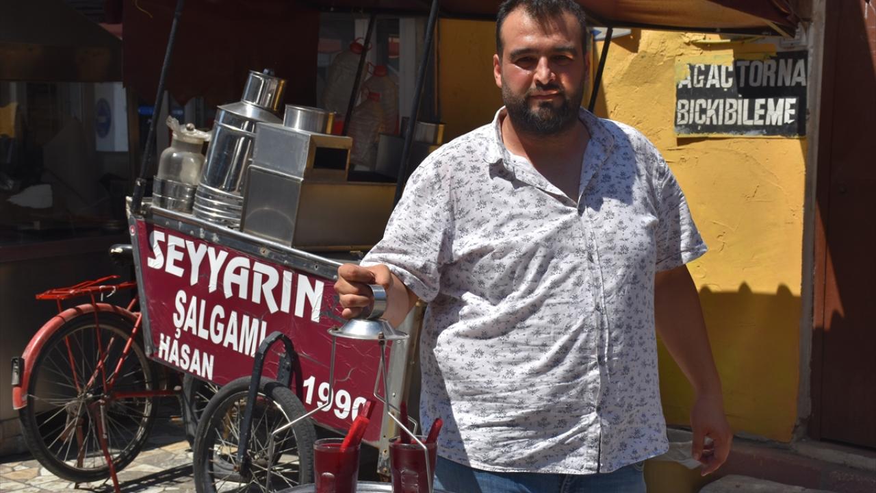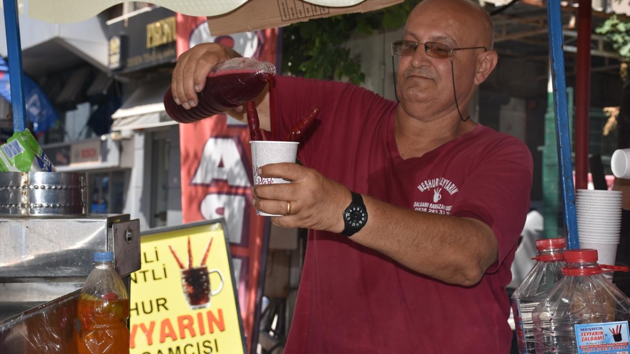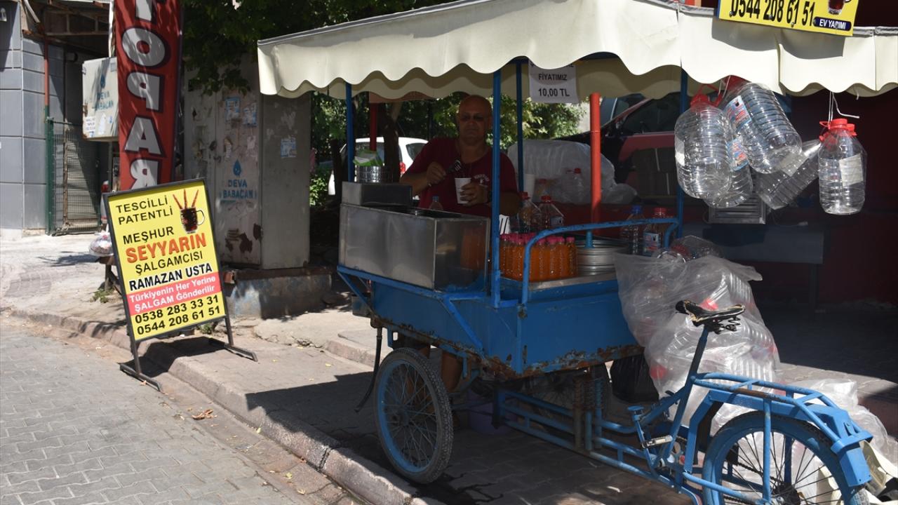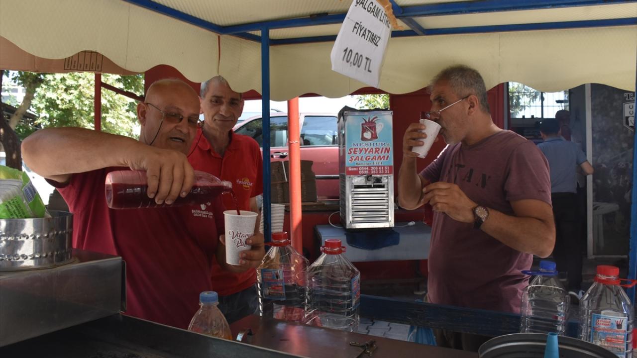 Adana`nın kavurucu sıcaklarının da serinleten içeceği şalgam, kentin birçok yerindeki seyyar tezgahlarda satılıyor.