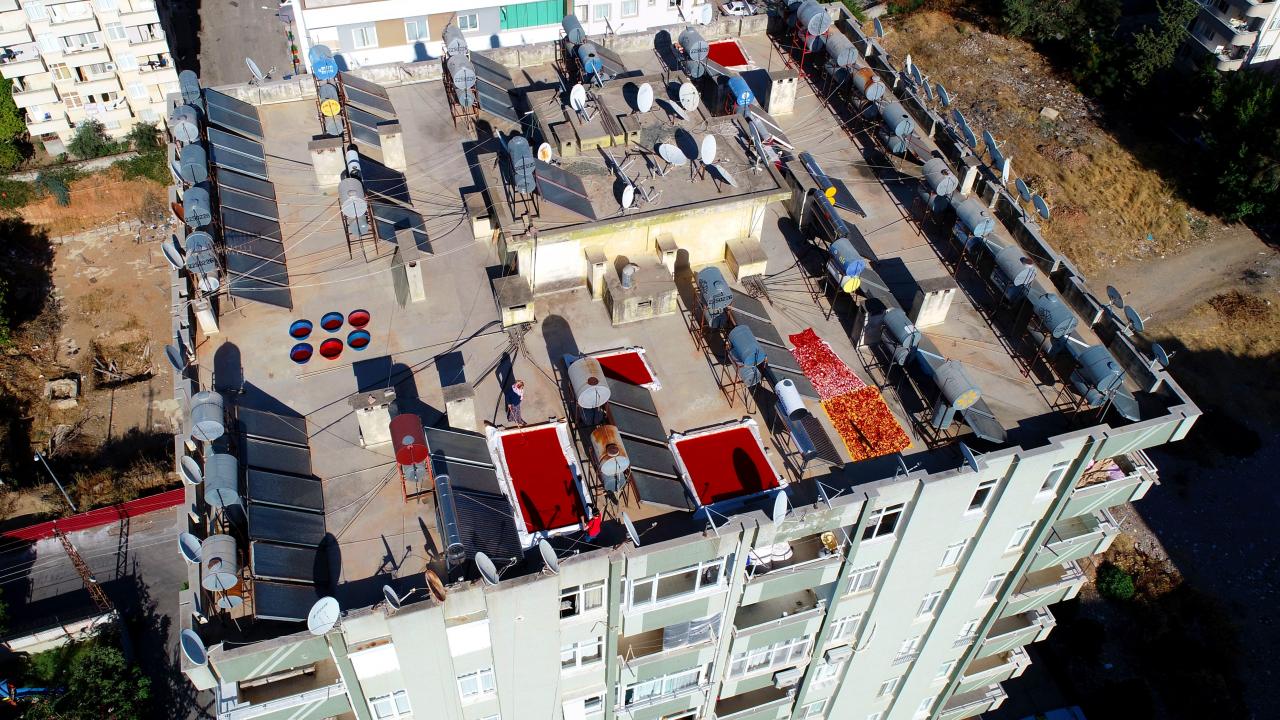 Kent genelinde bazı apartmanların ve müstakil evlerin damlarına serilen çekilmiş salçalık biberler, damları kırmızıya boyarken havadan da ilgi çekici görüntüler oluştu.
