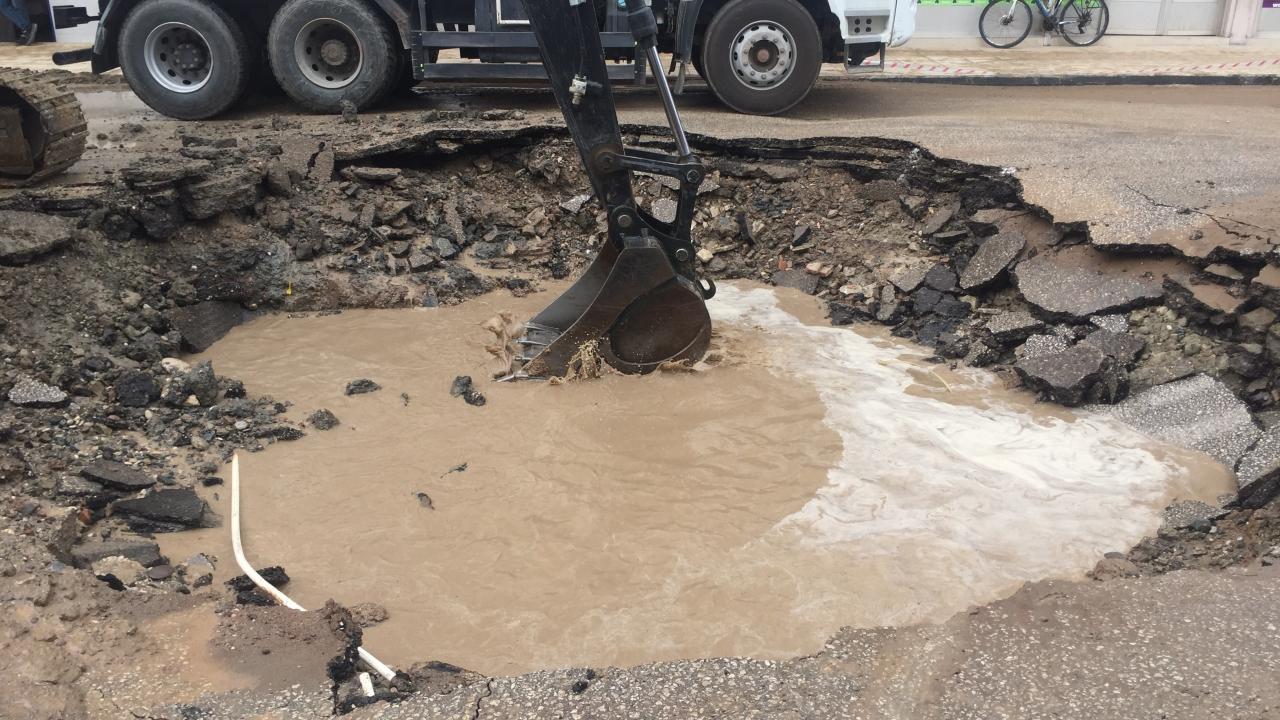 Patlayan su borusu nedeniyle yolda büyük çapta çukur ile su birikintileri oluştu.