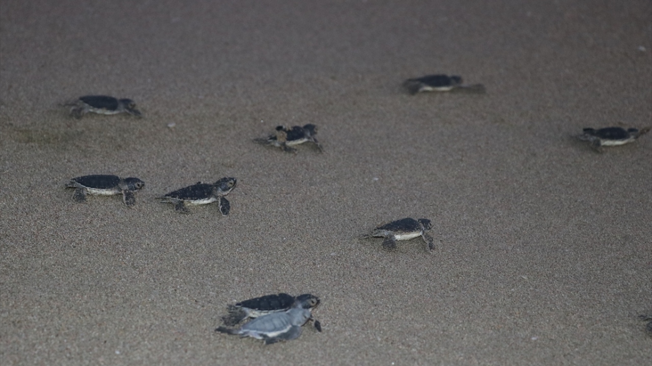 Yeşil deniz kaplumbağası yavruları, Akyatan sahilindeki yuvalarından çıkarak mavi sularla buluşuyor.