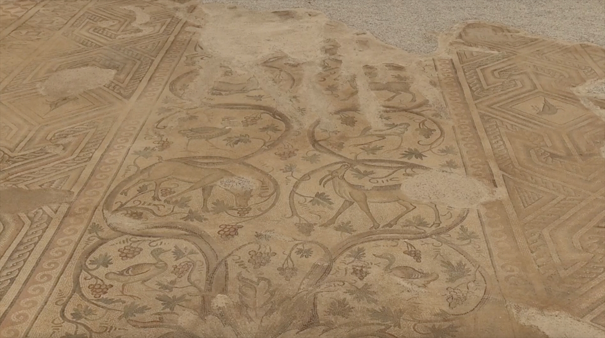2009`daki kazılarda bulunan ve 1500 yıl öncesine tarihlendirilen 155 metrekarelik mozaikte, yaban keçileri ve çeşitli hayvanların otlaması, kalp ve baklava motifleri görülüyor.