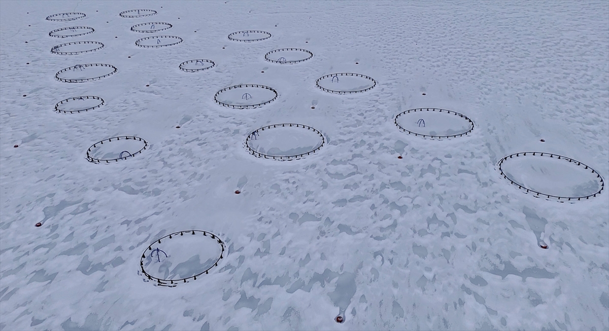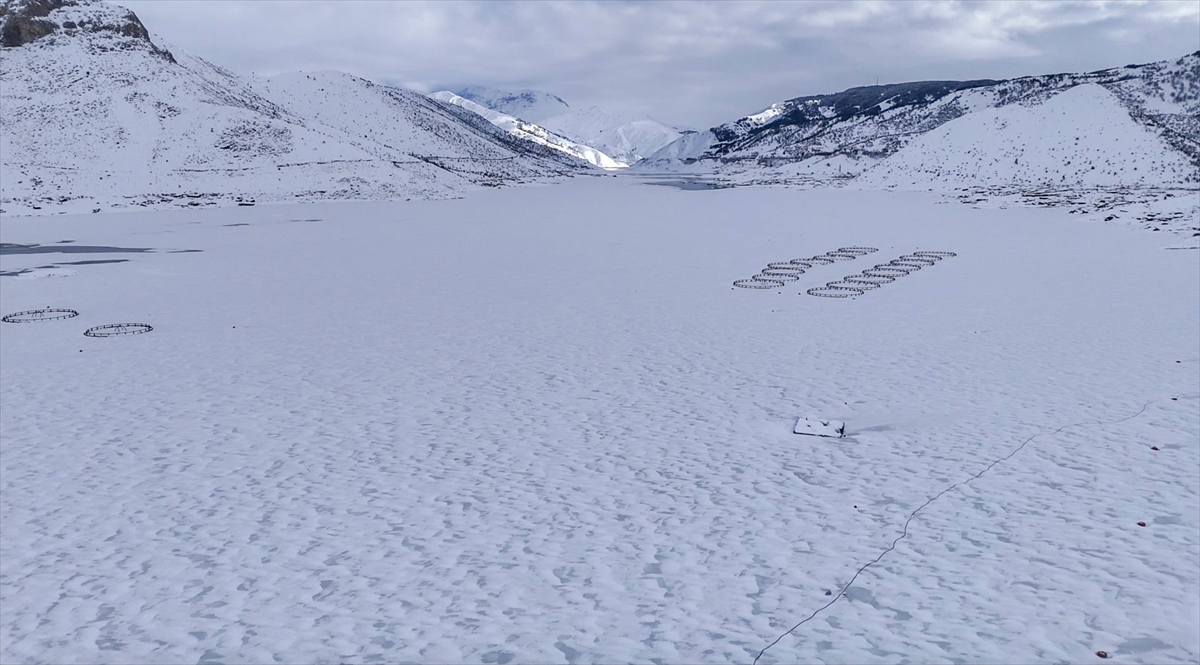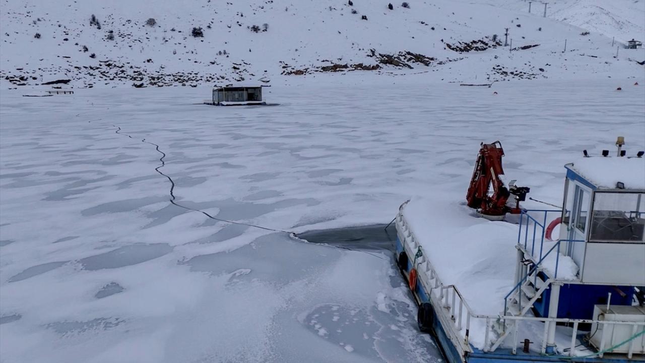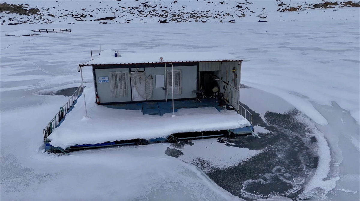 Göldeki tekne ve alabalık yetiştirilen kafeslerin de donduğunu aktaran Aktürk, "Çat Barajı`nın donduğunu duyunca bölgeye geldim. Baraj tamamen donmuş. Bu manzarayı yaklaşık 10 yıl önce görmüştük." dedi.