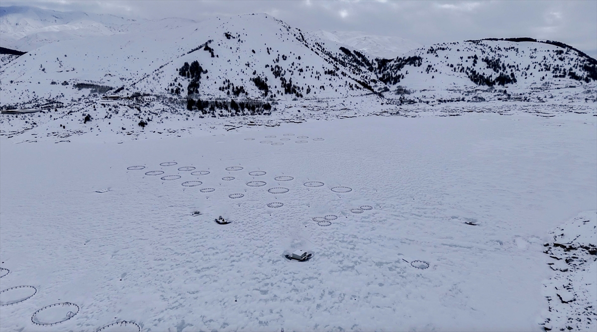 Barajdaki tekne, alabalık kafesleri ve yüzen adaların donması fotoğraf tutkunları ve doğaseverler için güzel manzaralar oluşturdu.