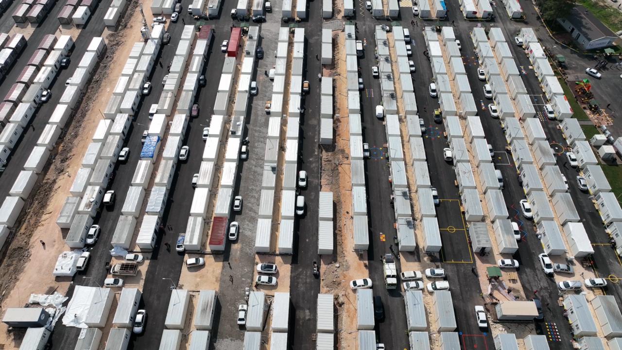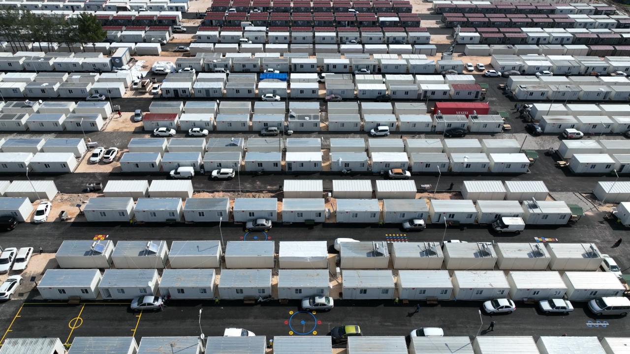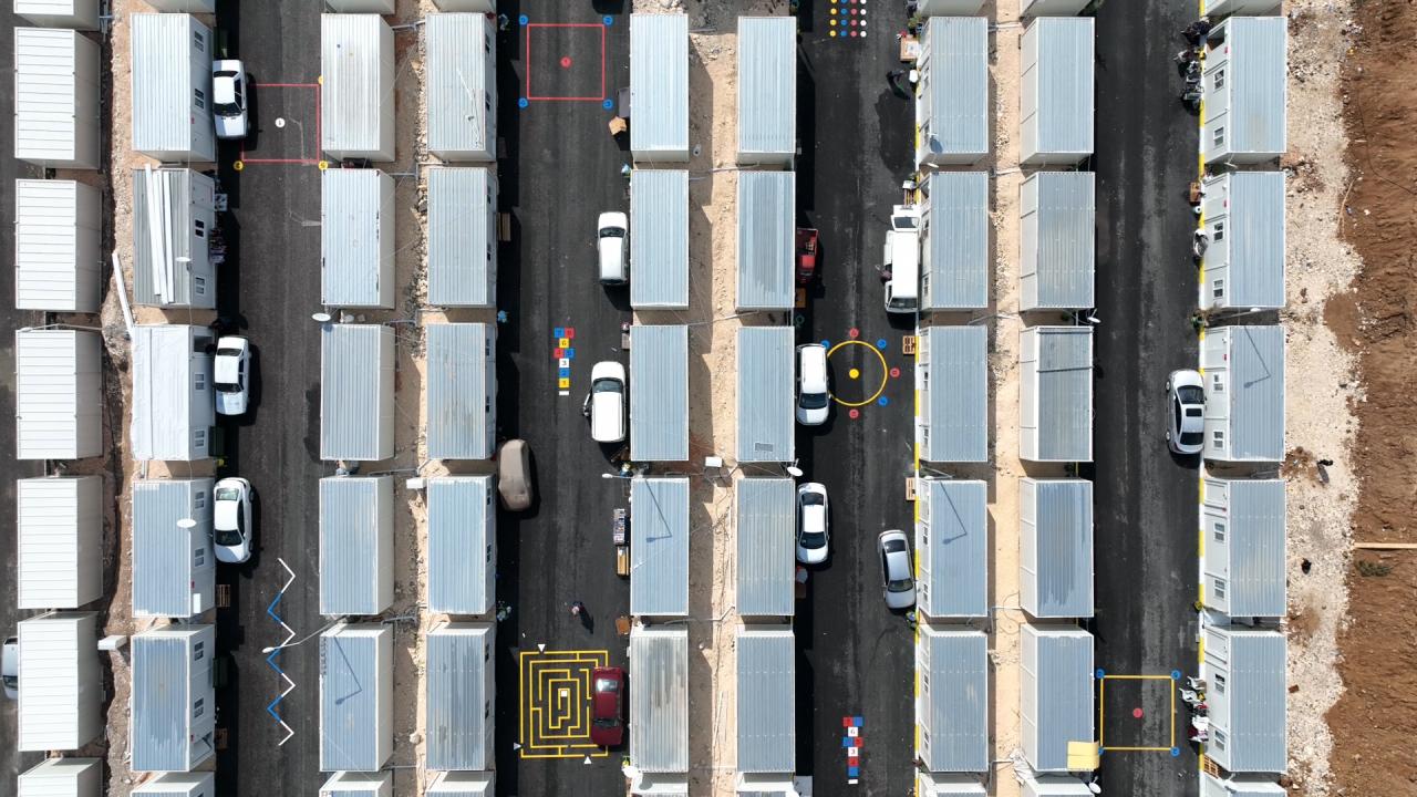 İş makineleri yardımıyla elektrik ve su hattının döşendiği yeni yaşam alanlarına, ısı yalıtımlı konteynerler yerleştiriliyor.