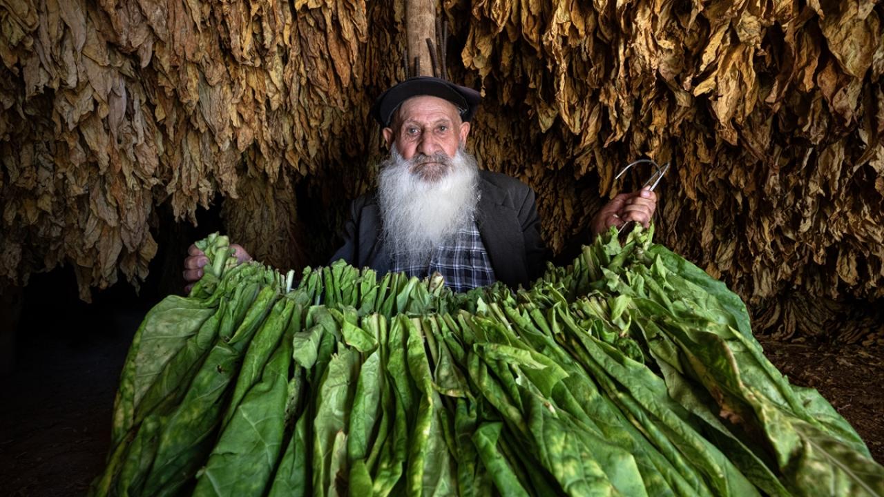 Burada yapraklar tütün şişine saplanarak iplere diziliyor ve iskelelere asılıyor.
