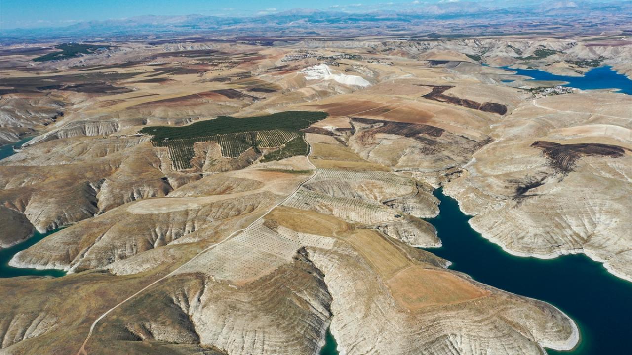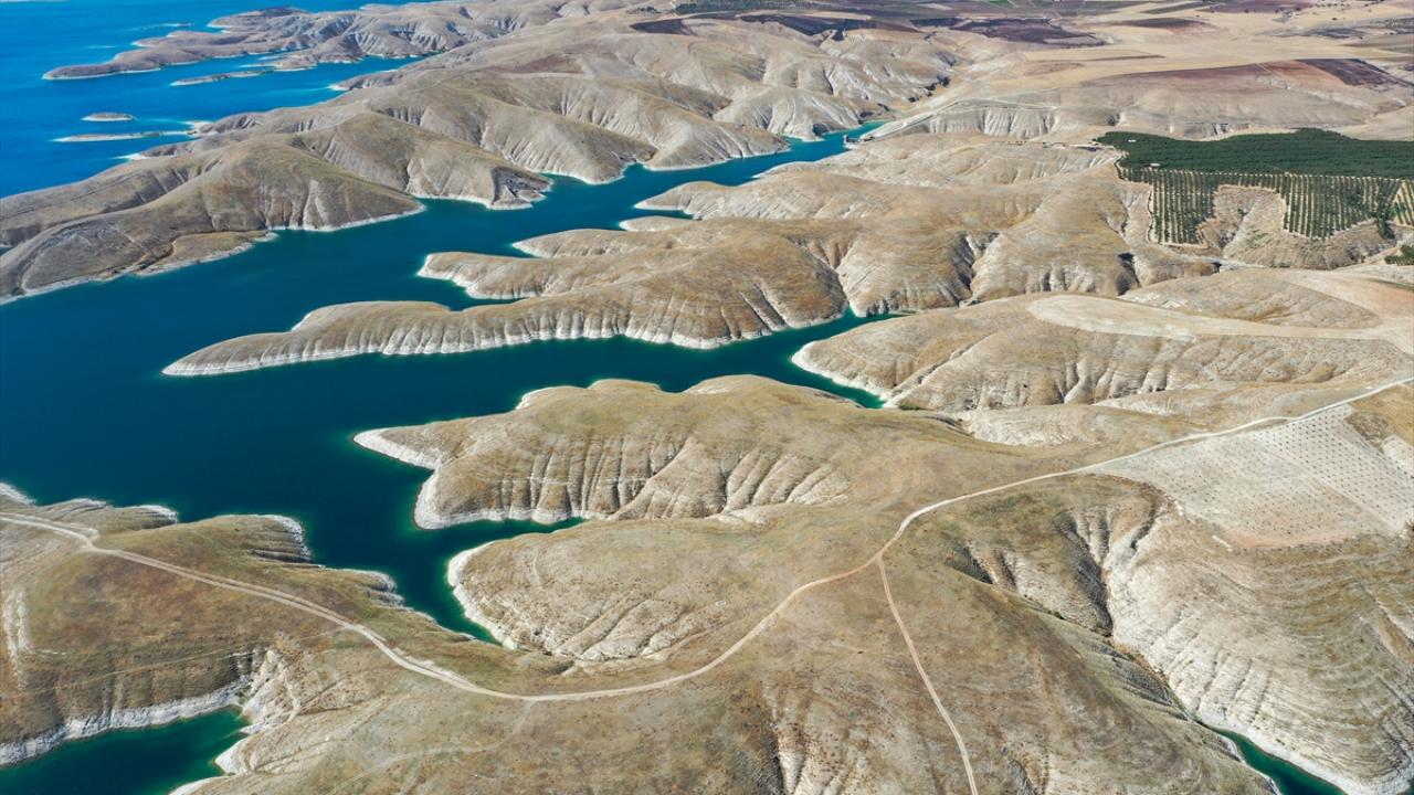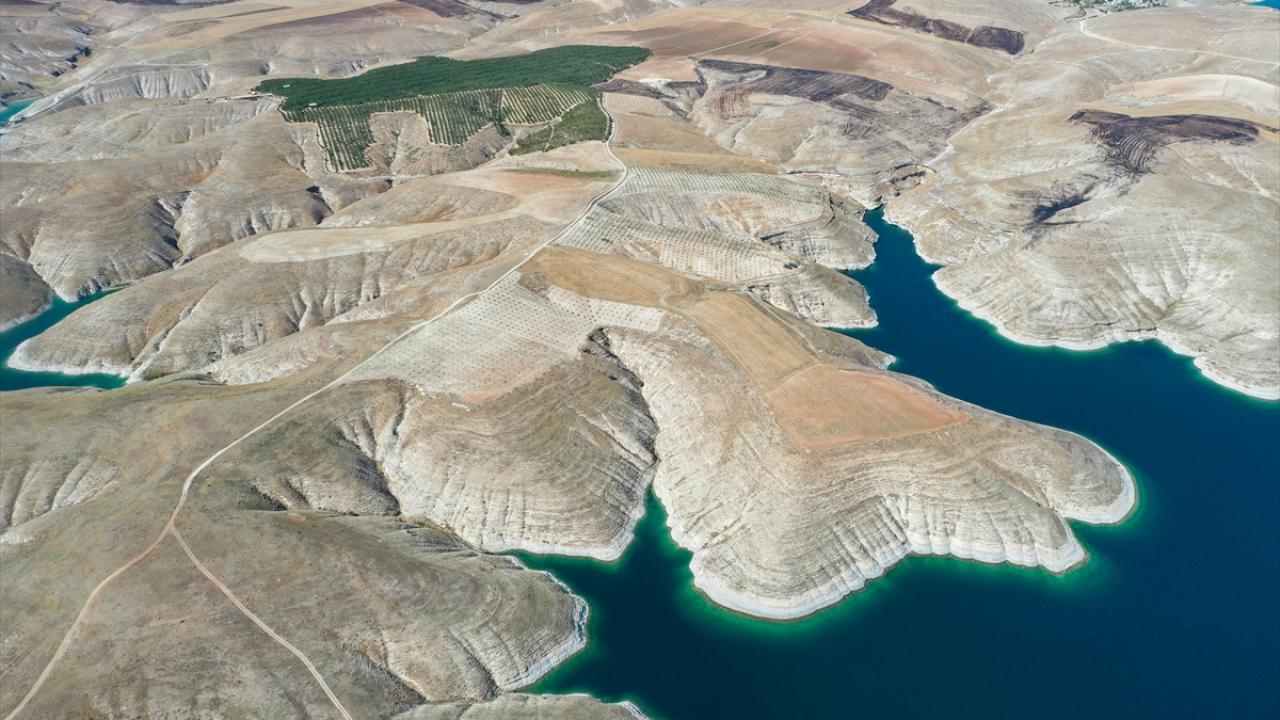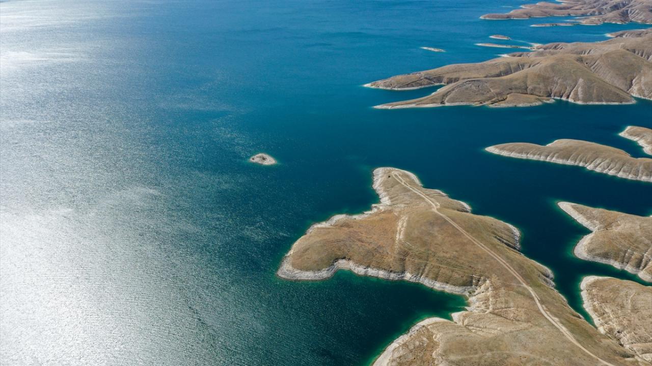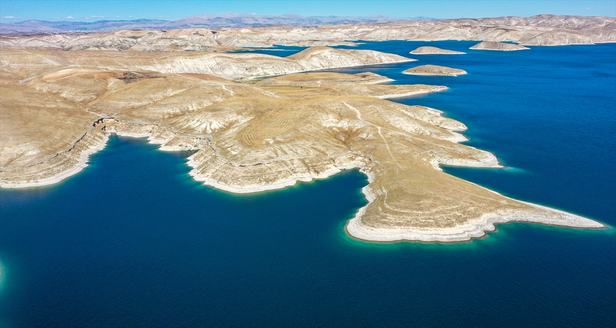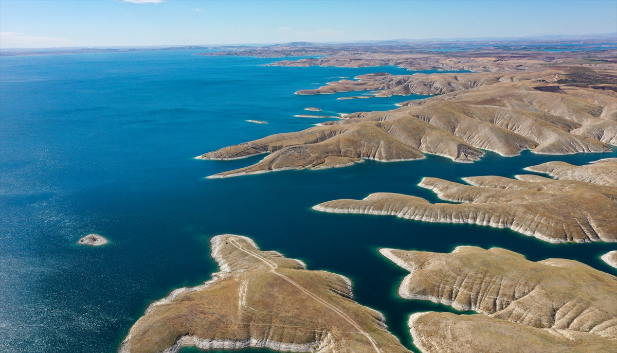 Adıyaman'daki Atatürk Baraj Gölü içinde bulunan yükseltiler, sonbahar aylarında suyun azalması nedeniyle adalara dönüşüyor.