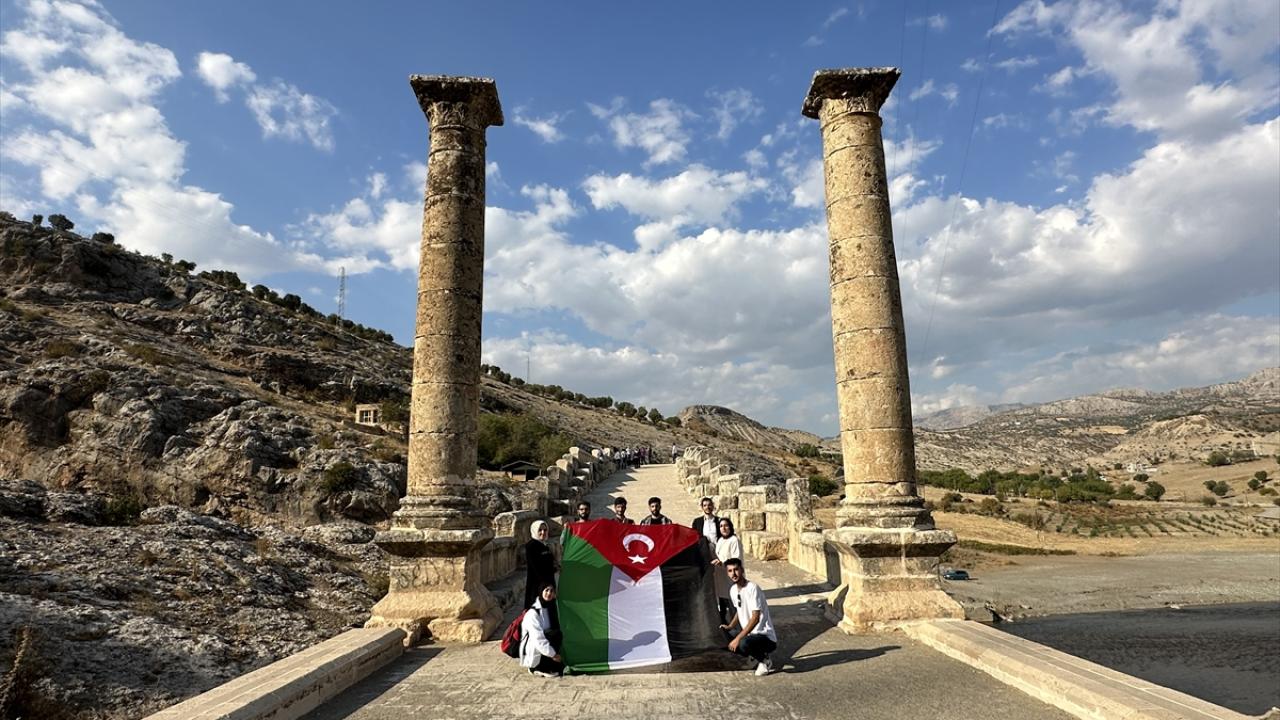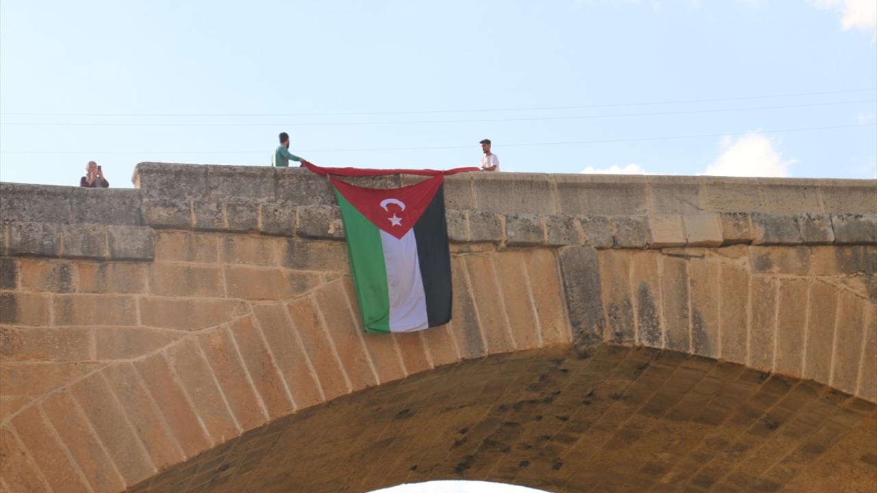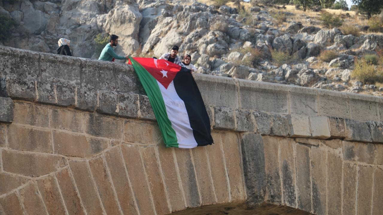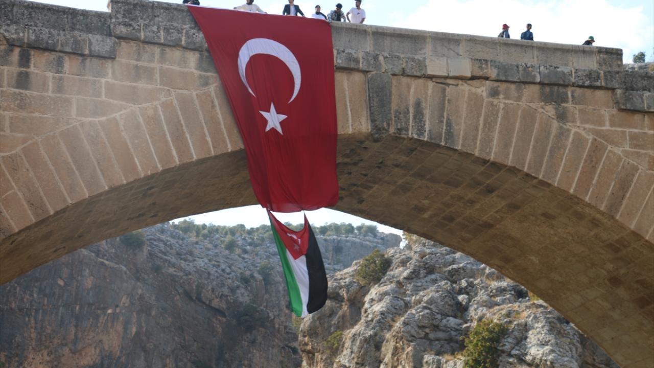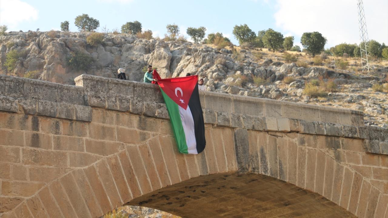Adıyaman'da bir grup genç, İsrail'in Gazze'deki el-Ehli Baptist Hastanesine yönelik saldırısı protesto etmek için Kahta ilçesindeki Roma dönemine ait tarihi Cendere Köprüsü'ne Filistin bayrağı astı.