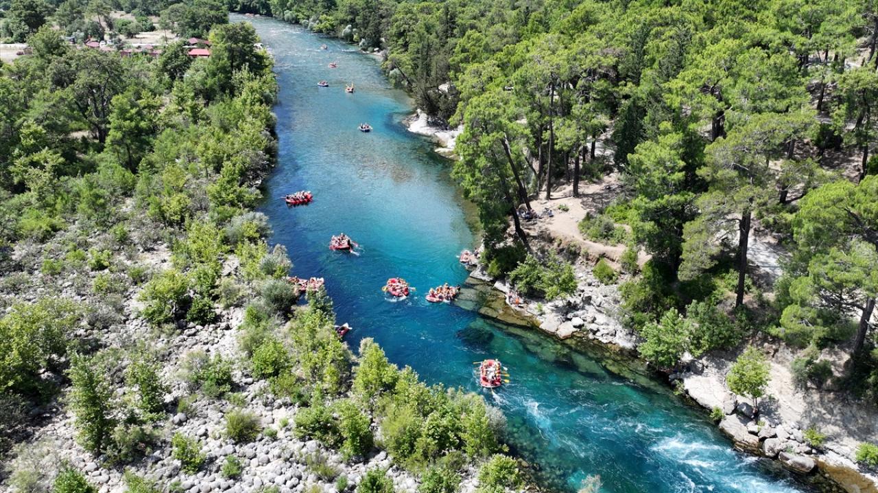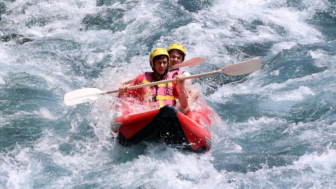 Antalya'nın Manavgat ilçesinde Köprülü Kanyon Milli Parkı'ndaki Köprüçay'ın 14 kilometrelik parkurunda kürek çeken tatilciler, heyecan dolu anlar yaşıyor.