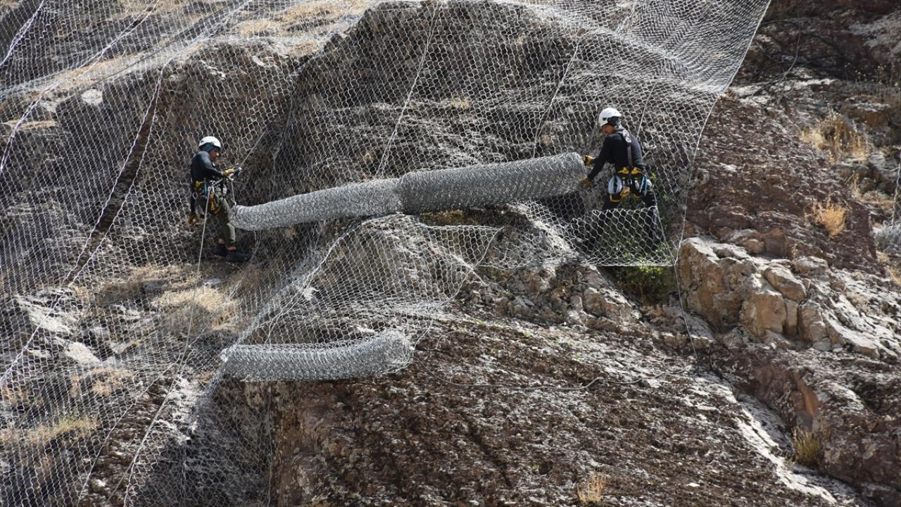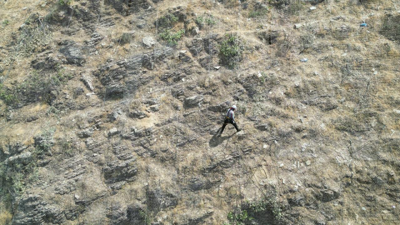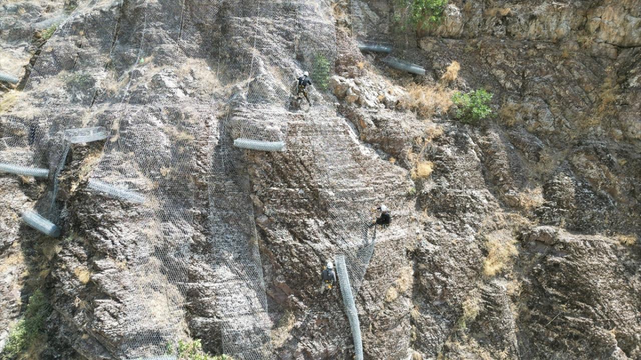 54 ev, 14 ağıl ve 1 iş yerinin güvenliğinin sağlanması amacıyla yürütülen çalışmalar kapsamında yamaç, çelik ağlarla örülüyor, düşme riski bulunan kayalar sabitleniyor.