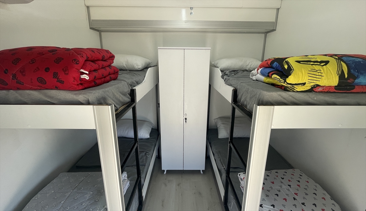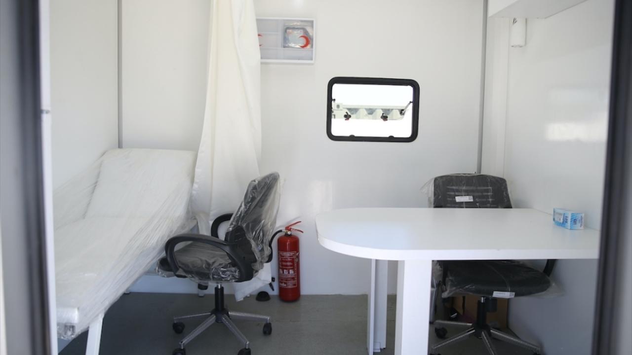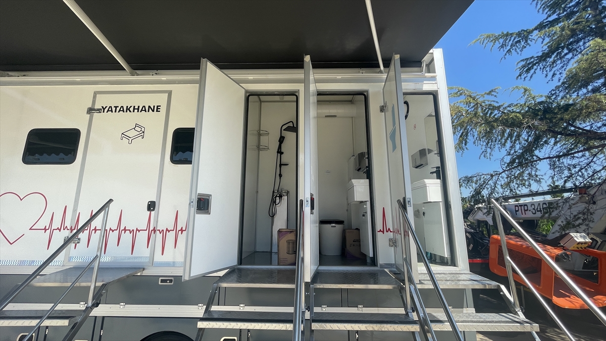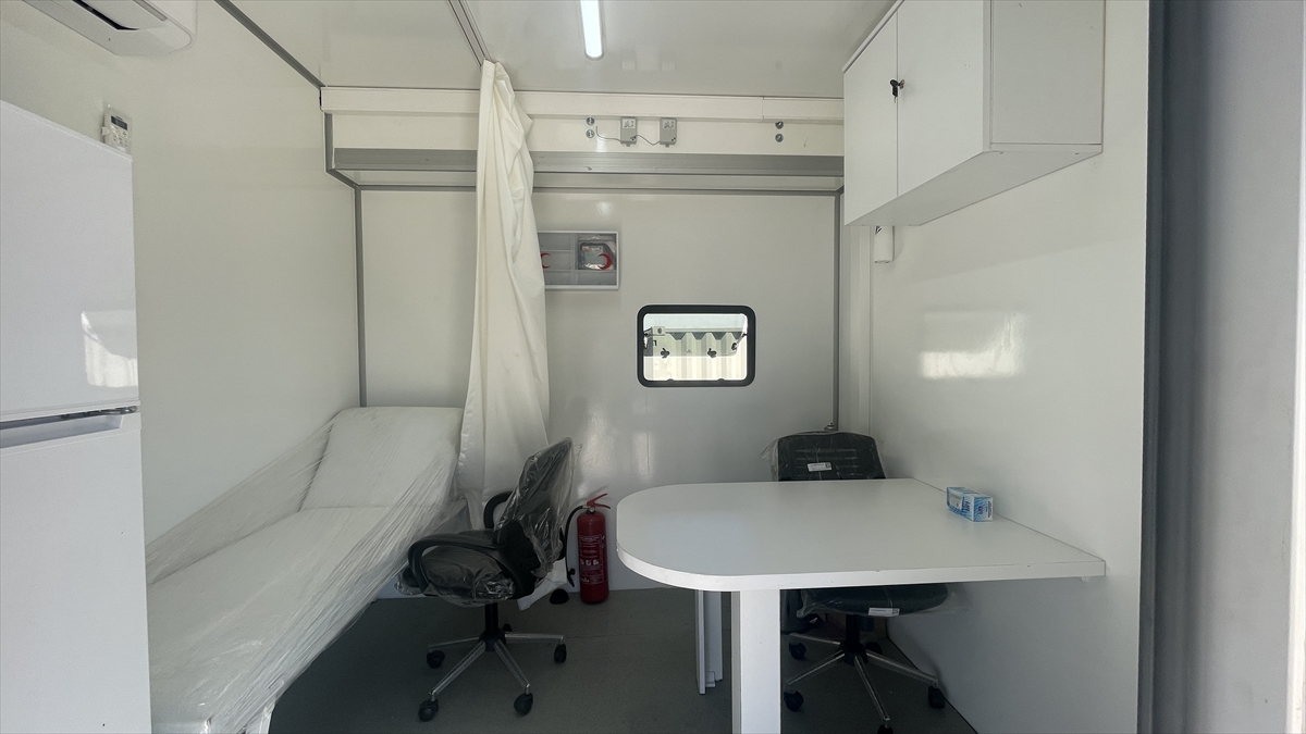 Enerjisini tamamen güneş panellerinden karşılayan treylerde, afetzedeler için doktor muayenesinin yapılabileceği sağlık odası da bulunuyor. Odada ayrıca ilaçların muhafaza edilebileceği ısıtıcı ve soğutucular da mevcut.