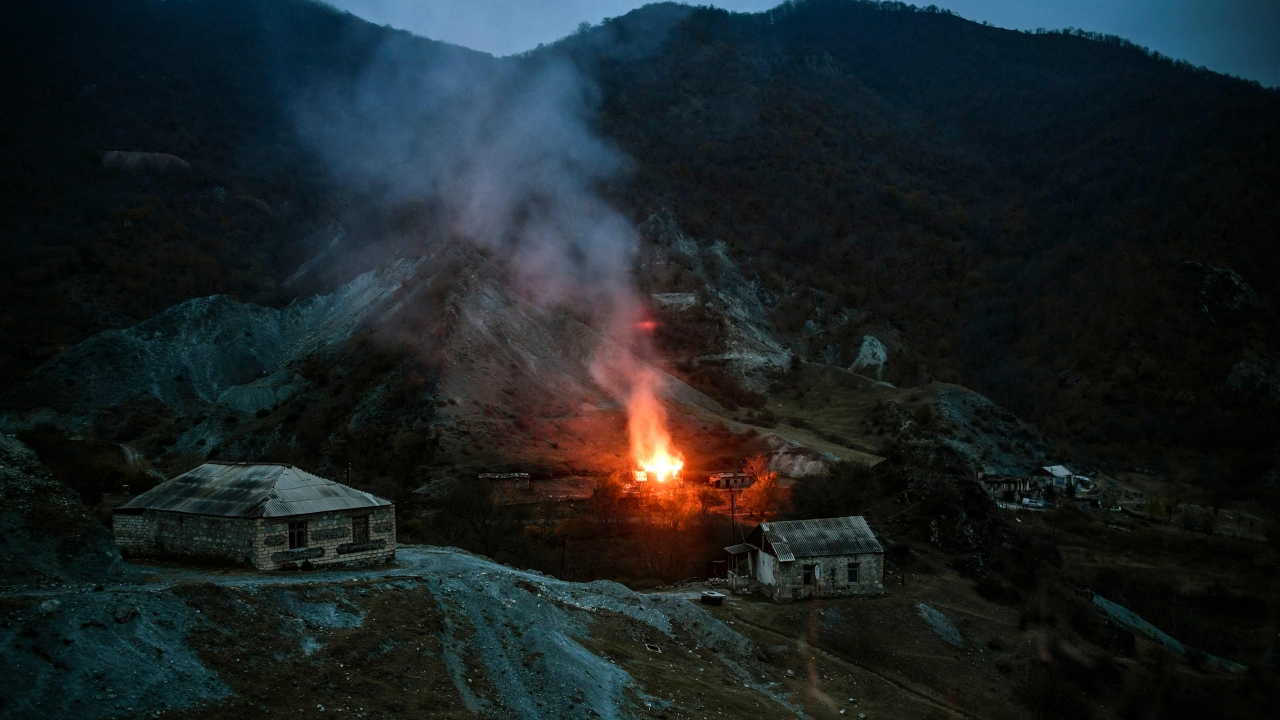 Ermenistan ile Azerbaycan arasında Dağlık Karabağ bölgesinde ateşkes kararı alınmasının ardından, Ermenistan ateşkesi ihlal etmesi sonucu alev alan bir ev.