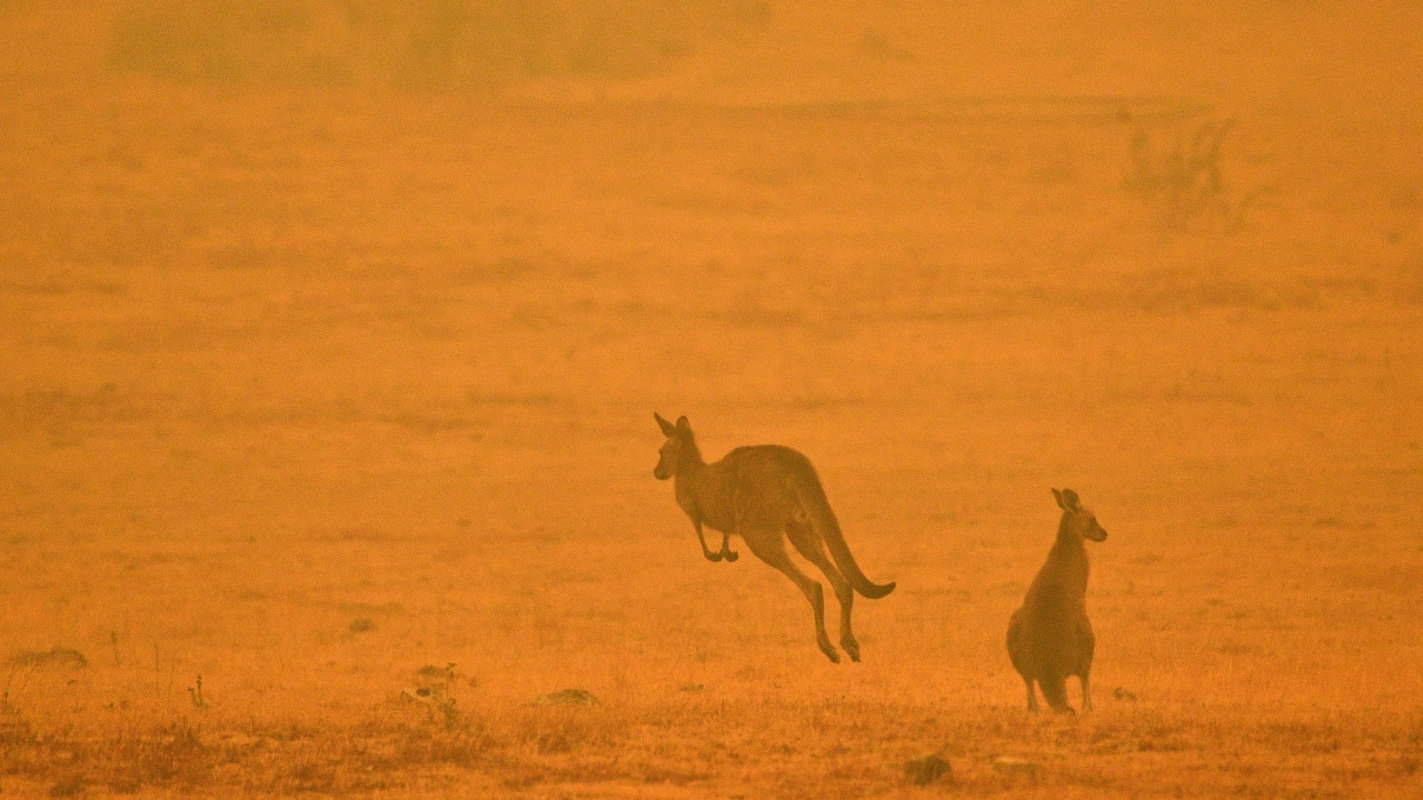 Avustralya`da aylar boyunca söndürülemeyen orman yangınlarından kaçan bir kanguru.