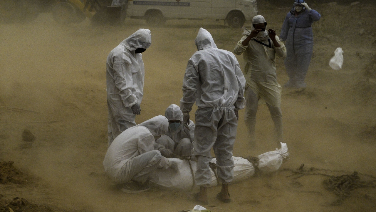 10 Mayıs 2020`de Yeni Delhi`deki bir mezarlığa gömülen koronavirüs hastası, koruyucu kıyafetler giyen akrabaları tarafından toprağa verildi.