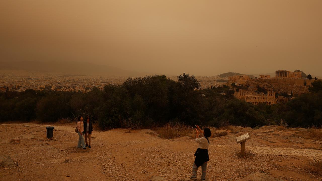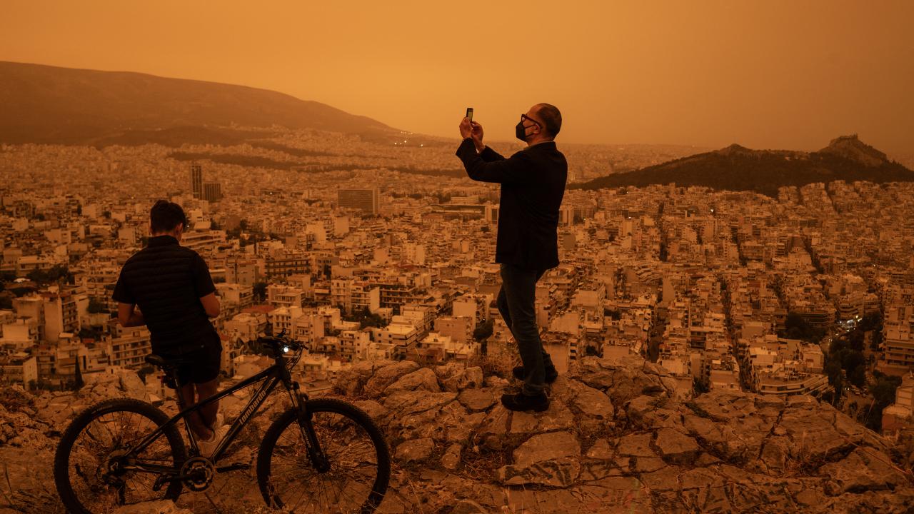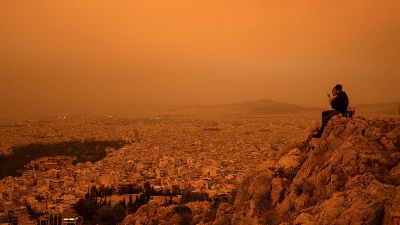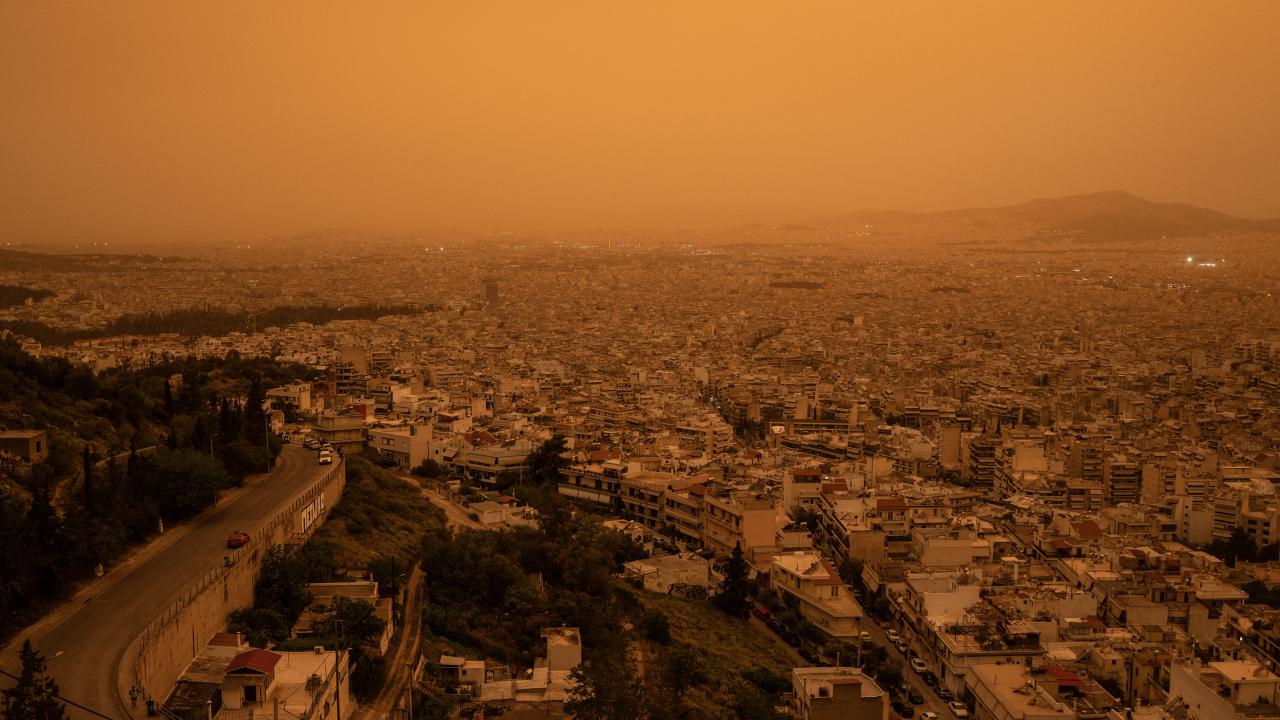 Afrika tozunun Yunanistan'ın Atina şehrini kaplamasının ardından gökyüzü turuncuya dönüştü. Şehrin dört bir yanında Mars'ı andıran görüntüler oluştu.
