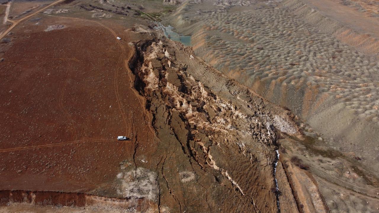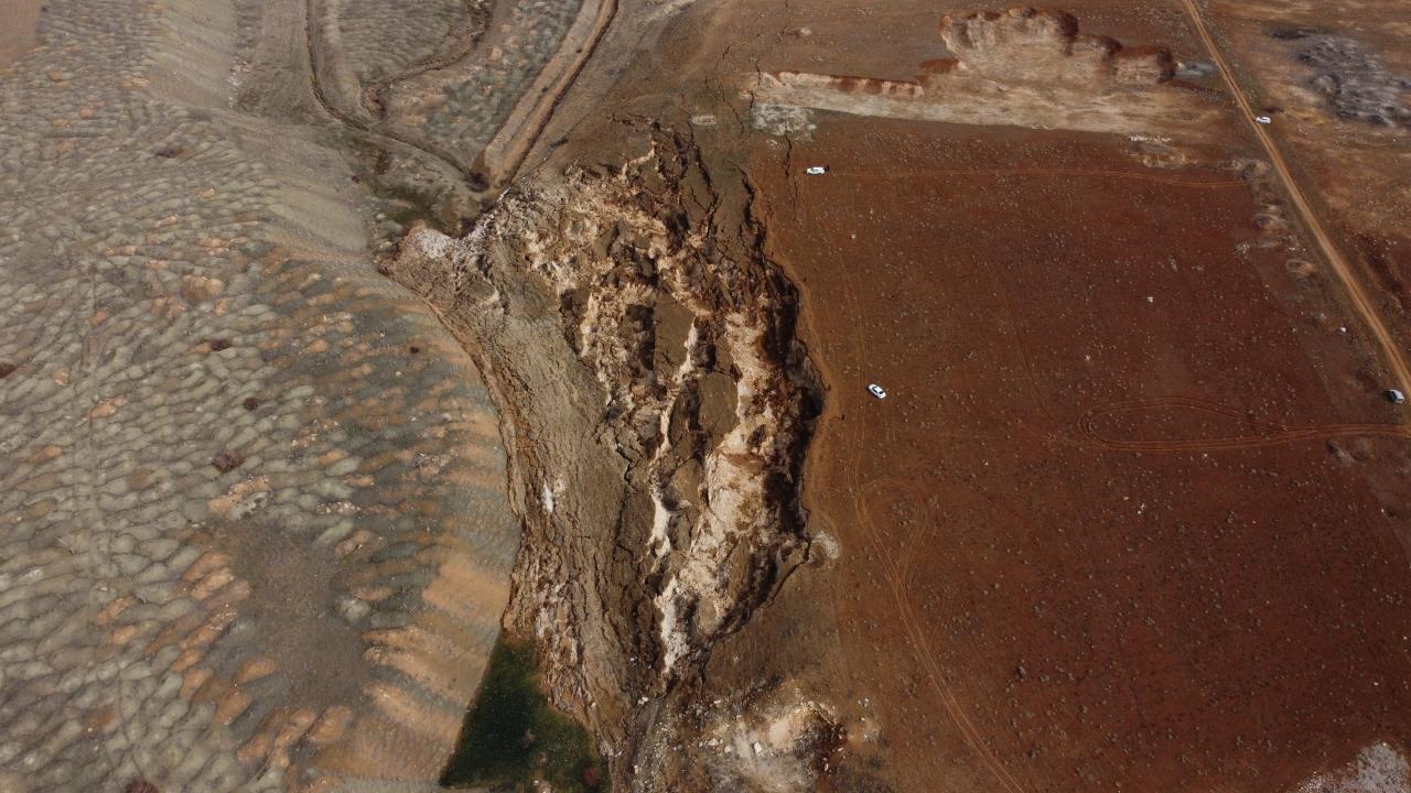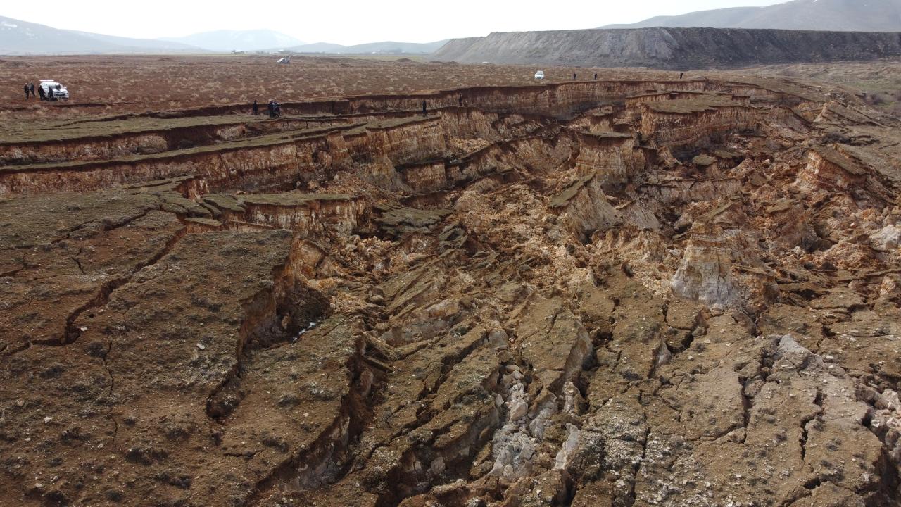 Derinliği 15, genişliği 50 ve uzunluğu 150 metreyi bulan yarık havadan görüntülendi.