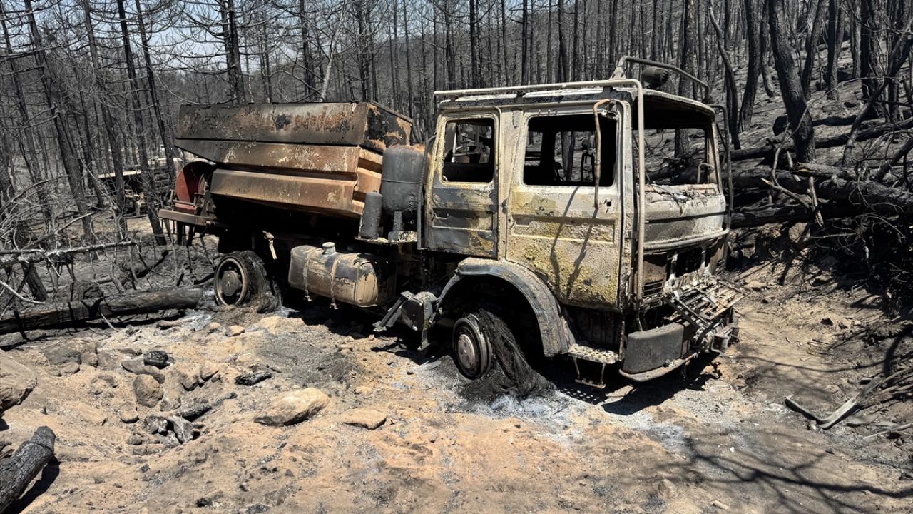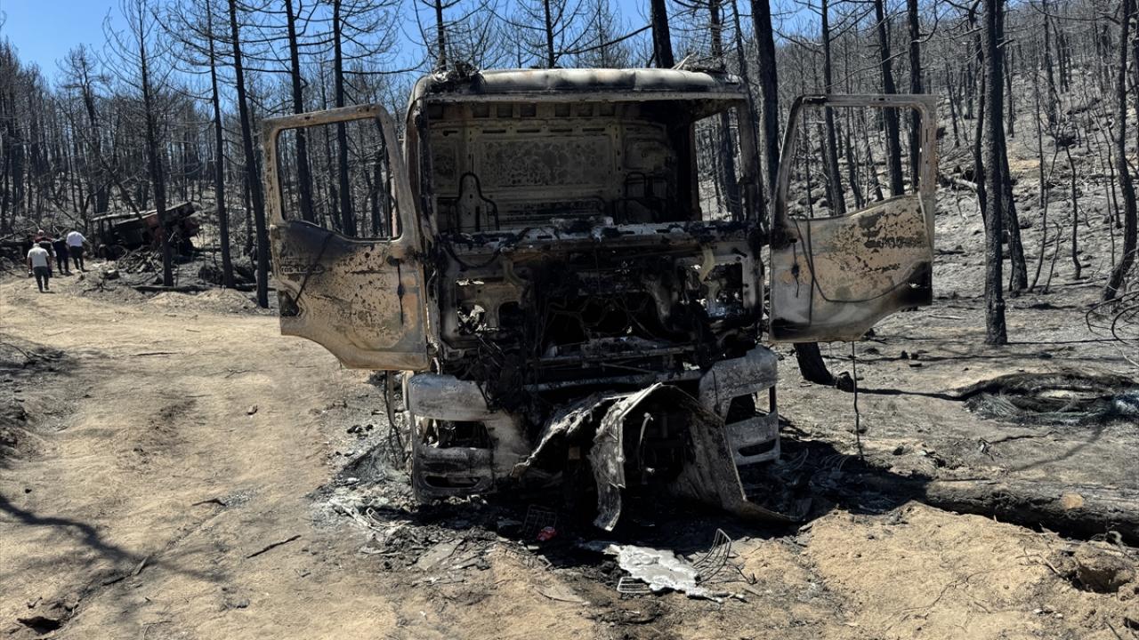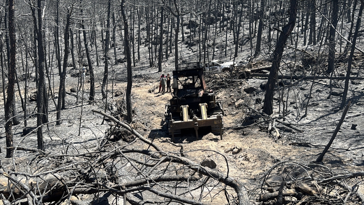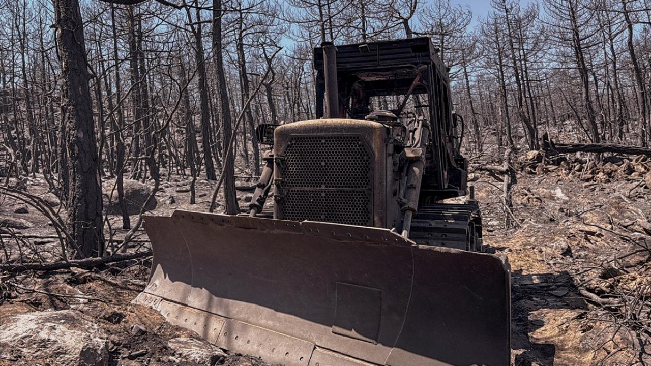 Yer yer dumanların yükseldiği ve yeşil örtünün adeta küle döndüğü bölgede, yanmış dozer, pikap ve arazözler dikkati çekti.
