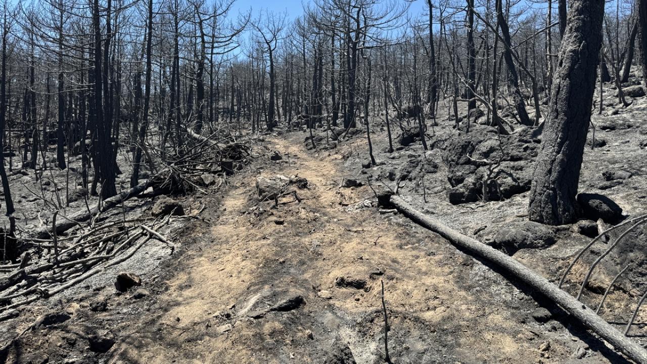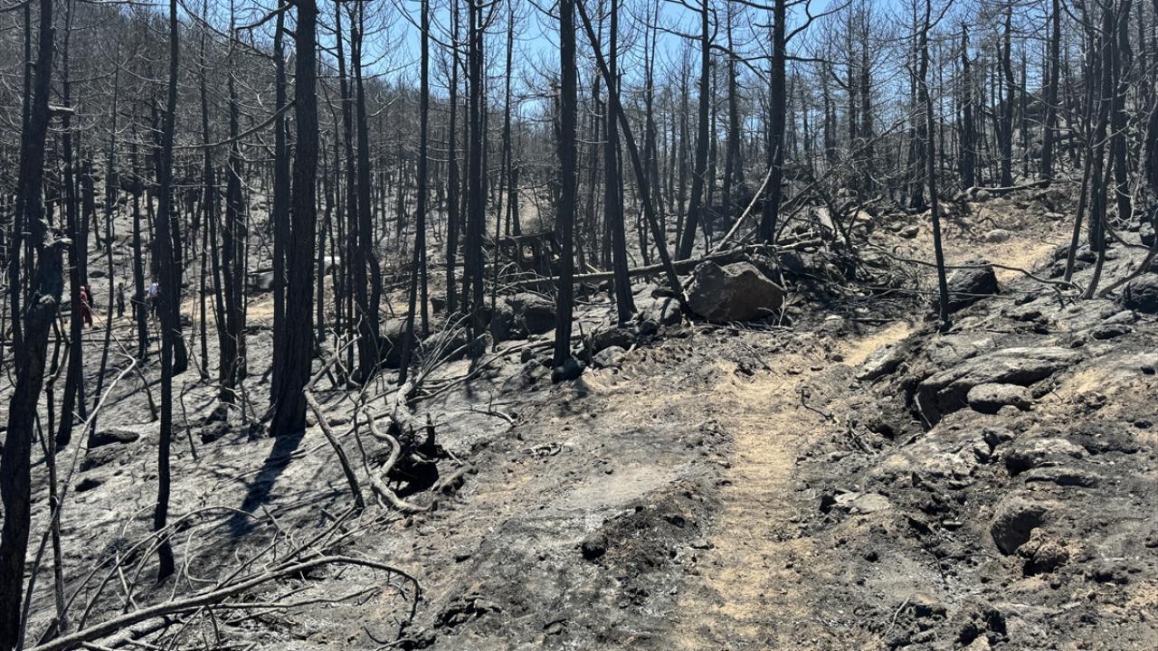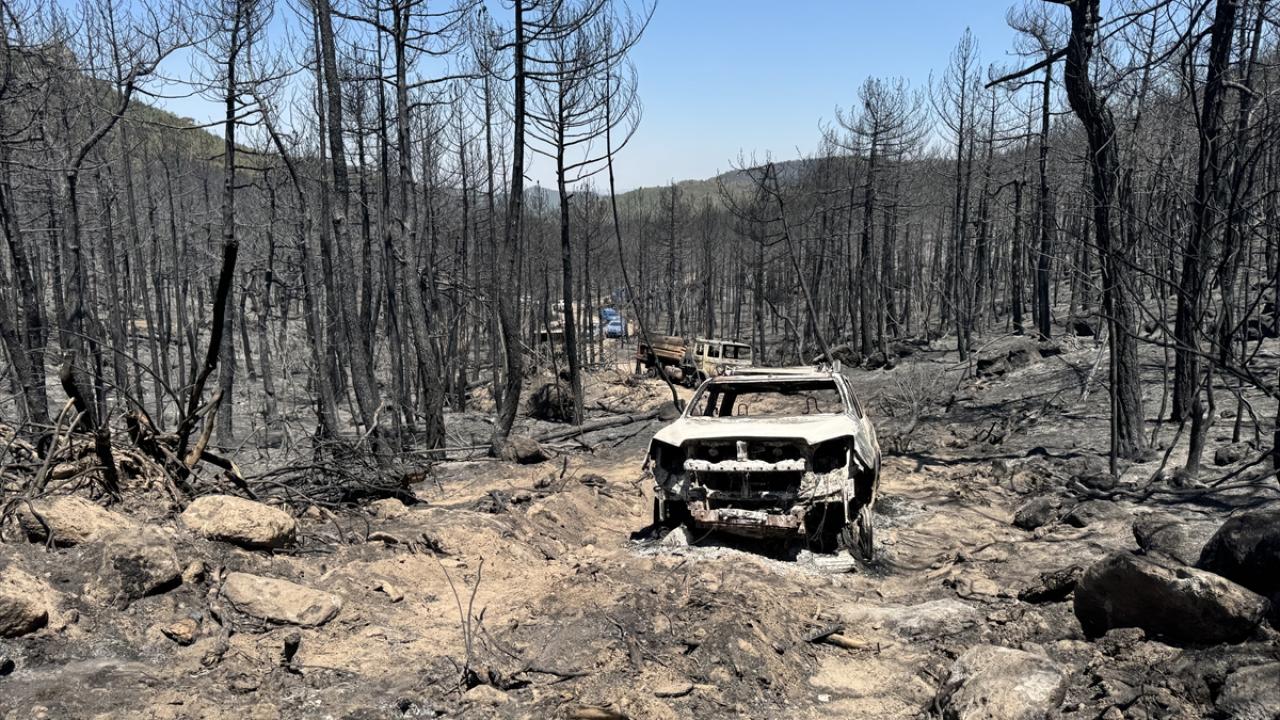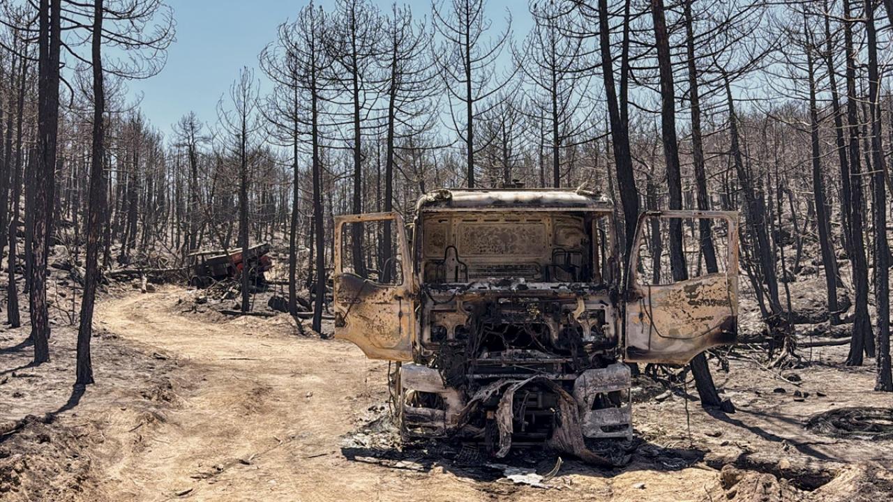 Yer yer dumanların yükseldiği ve yeşil örtünün adeta küle döndüğü bölgede, yanmış dozer, pikap ve arazözler dikkati çekti.