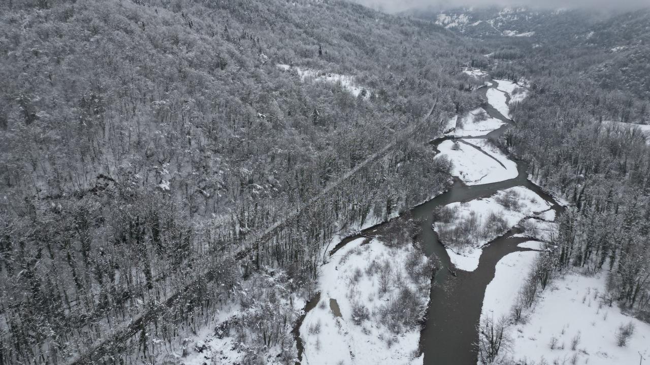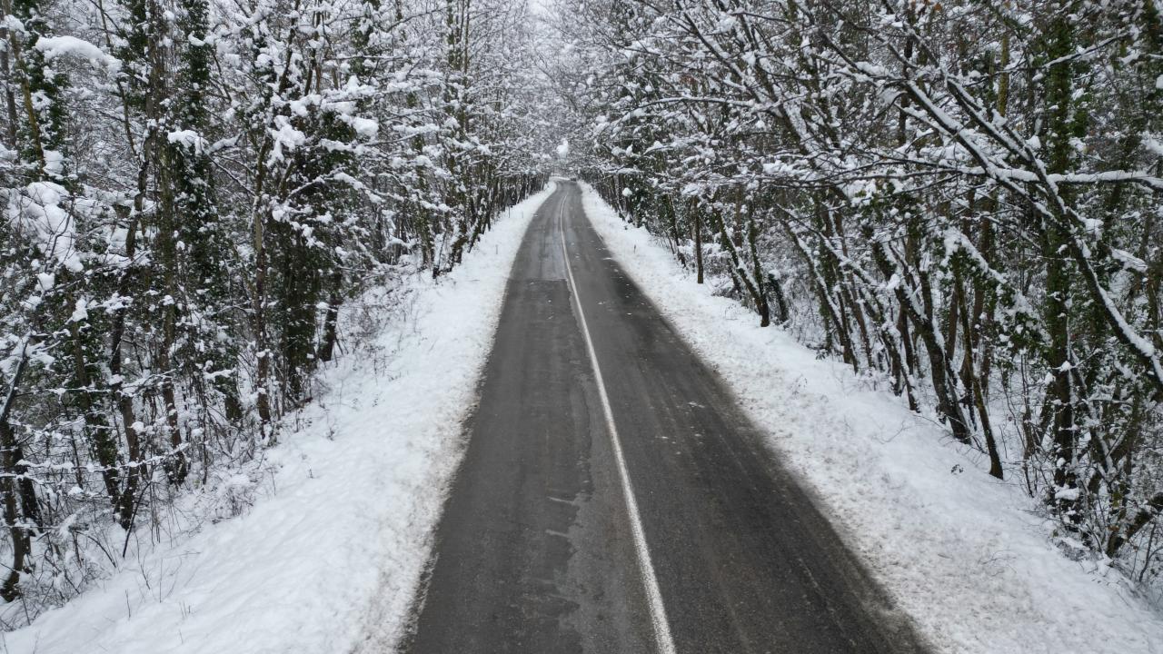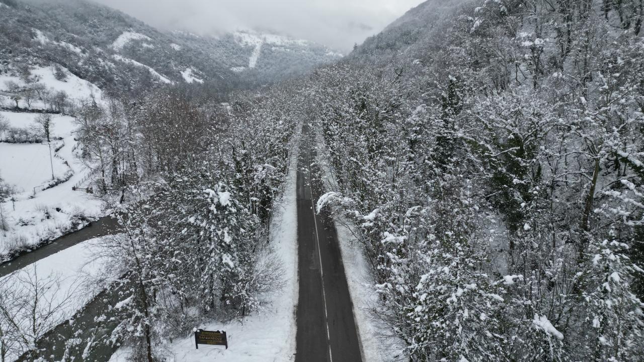Bartın ile Karabük arasında iki tarafı ağaçlarla kaplı olan ve 'Ağaç tünel yol' olarak bilinen kara yolunda, kar yağışıyla birlikte ortaya çıkan manzara, dron ile görüntülendi.
