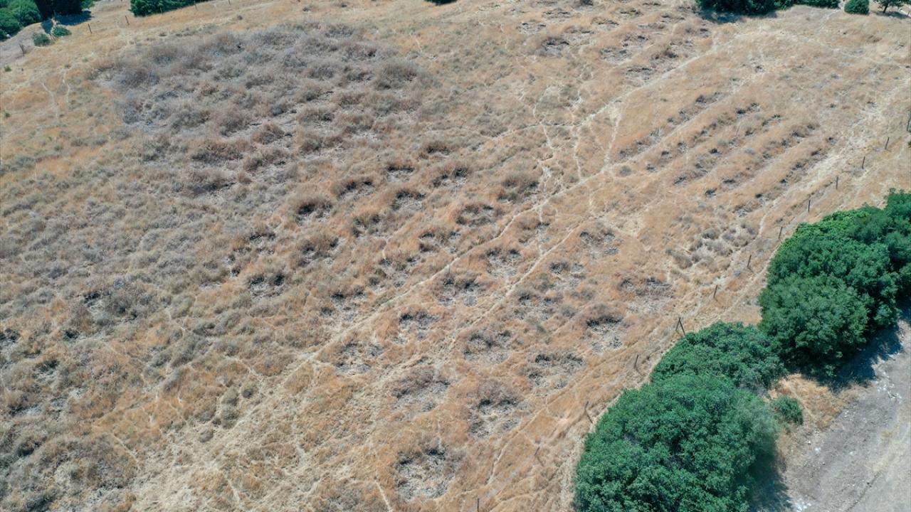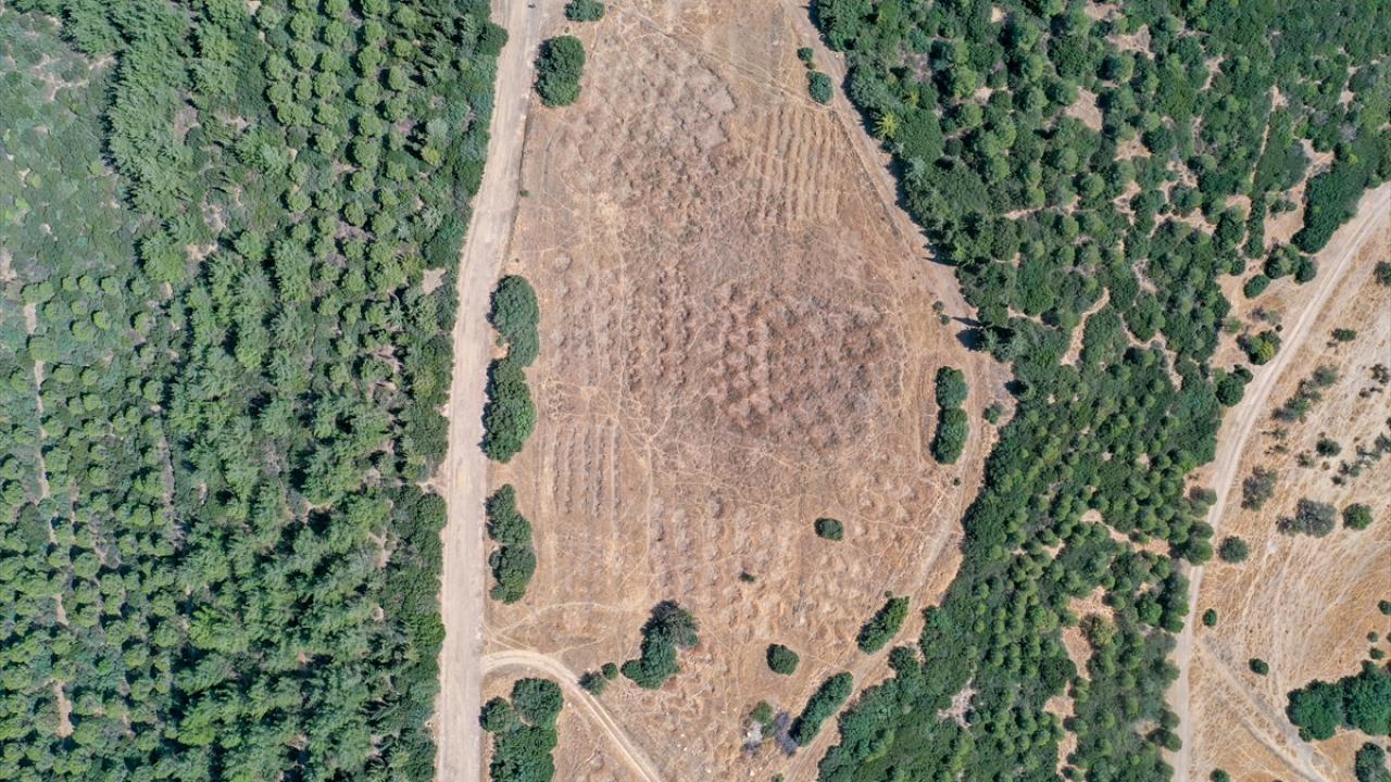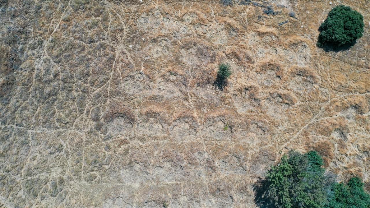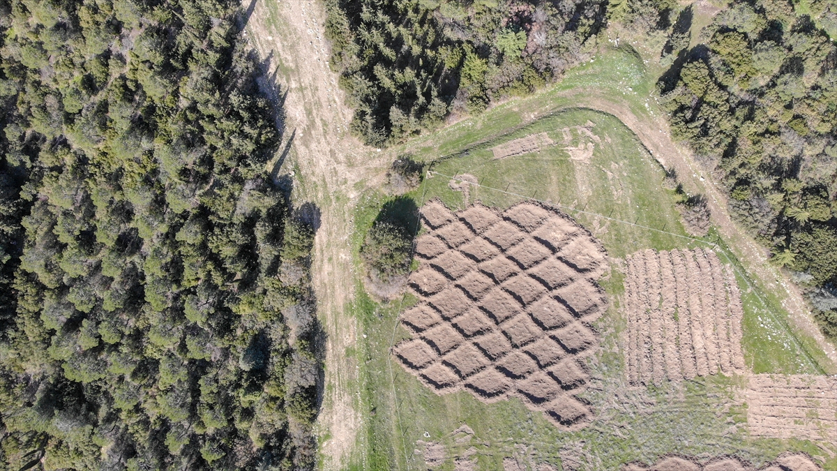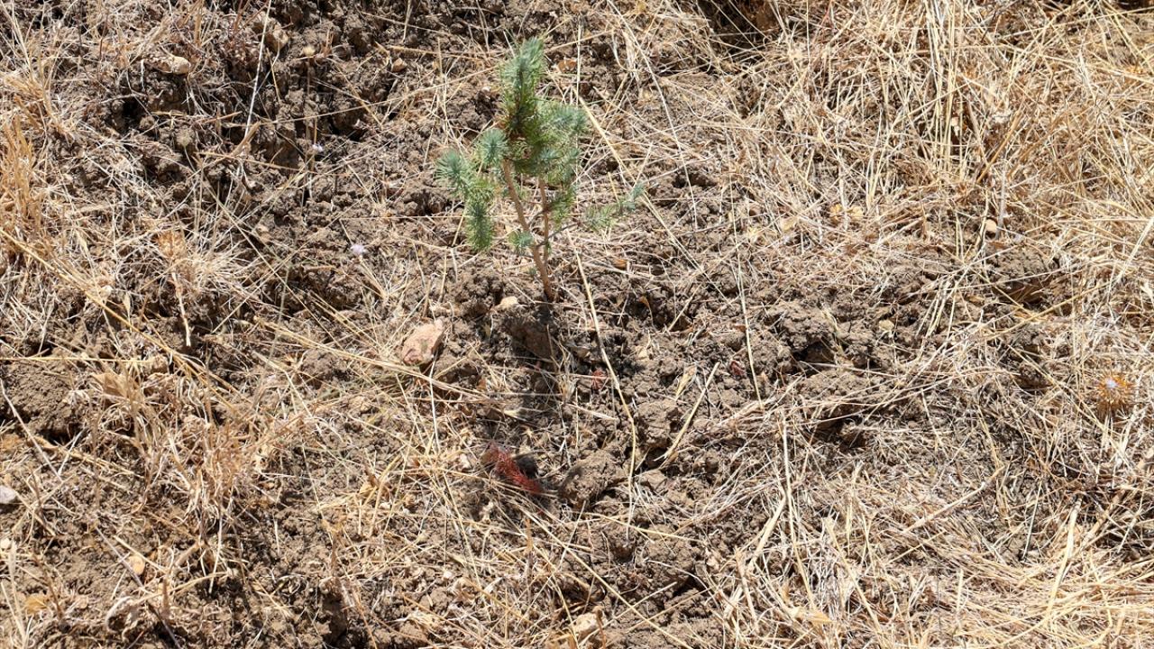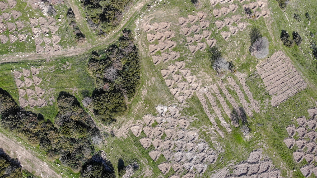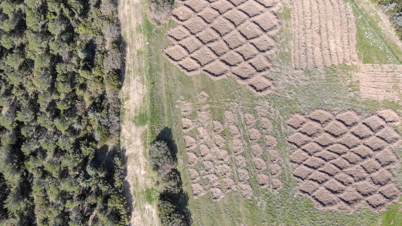 İzmir'de kuraklığın etkilerini azaltmak amacıyla araziye açılan hilal ve baklava şeklindeki setlerle su hasadı yapılarak gerçekleştirilen fidan üretimi, olumlu sonuçlandı.