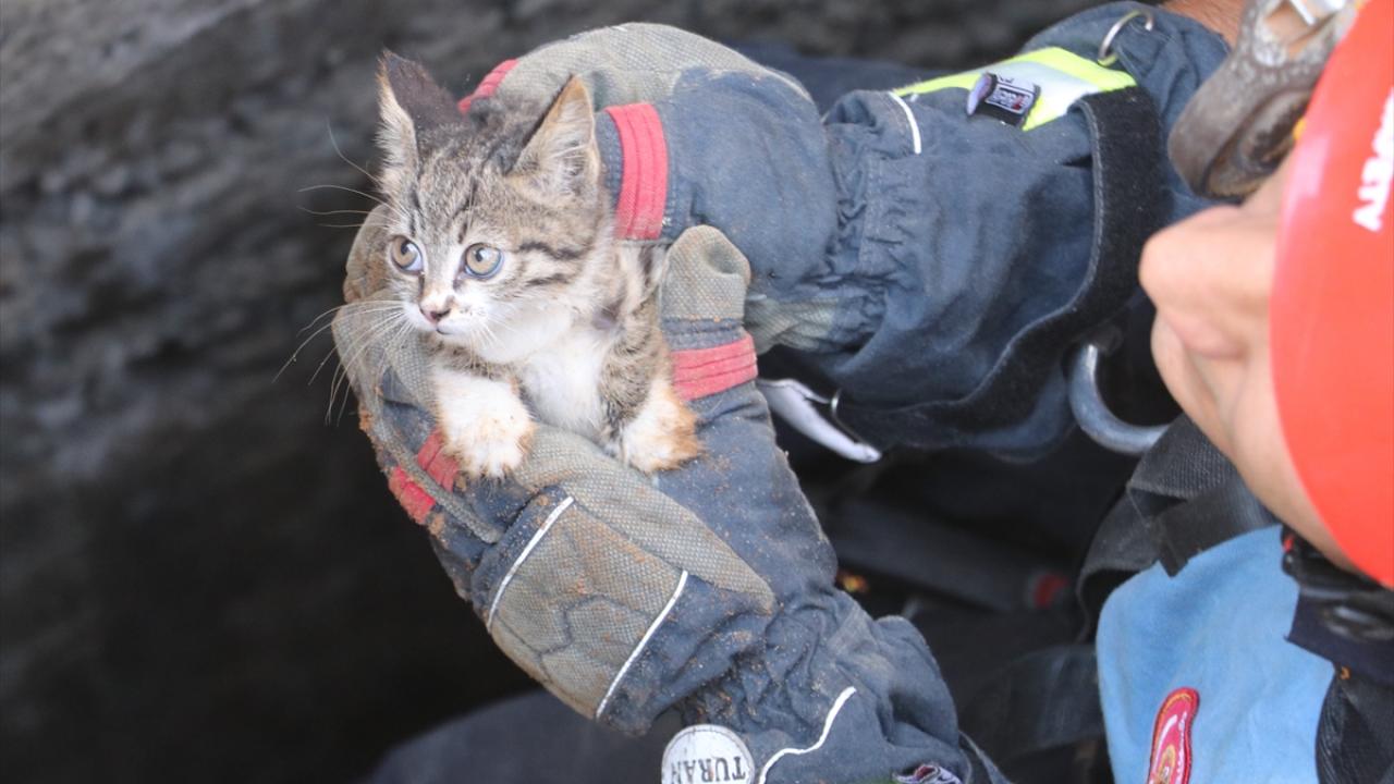 Halatla kuyuya inen itfaiye eri, yaklaşık 1 saatlik çalışmanın ardından kedi yavrusunu bulunduğu yerden çıkardı.