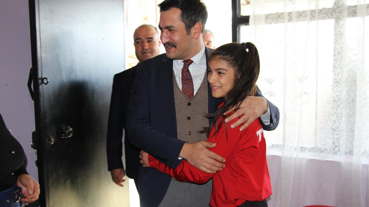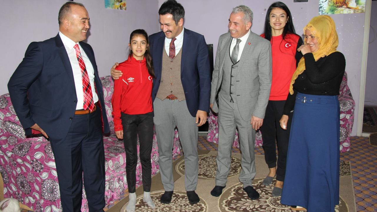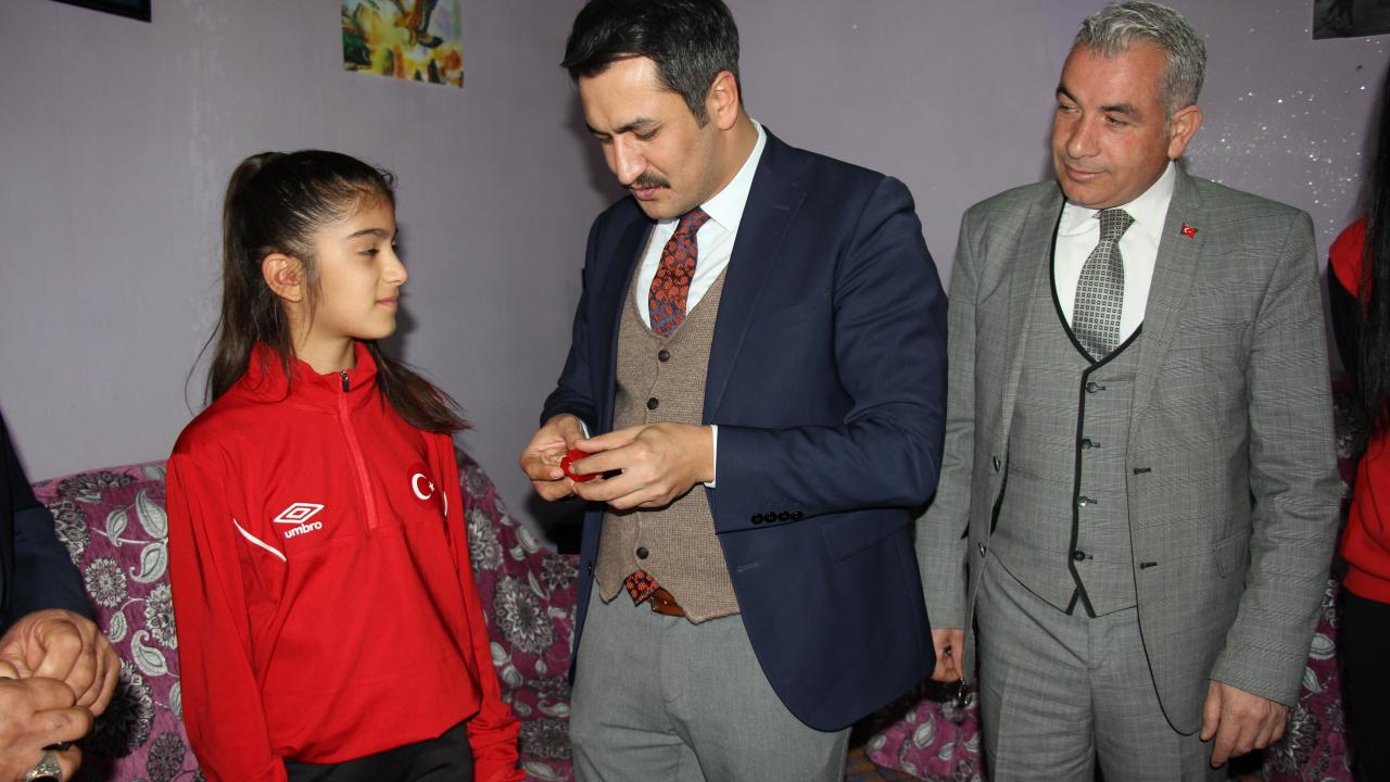Şampiyon sporcu Birgül Şimşek’i ziyaret eden Spor Şube Müdürü Cemil Budak ile Ağrı Gençlik ve Spor İl Müdürü İsmail Çalgan, sporcuyu tebrik ederek başarısından dolayı altın hediye etti.