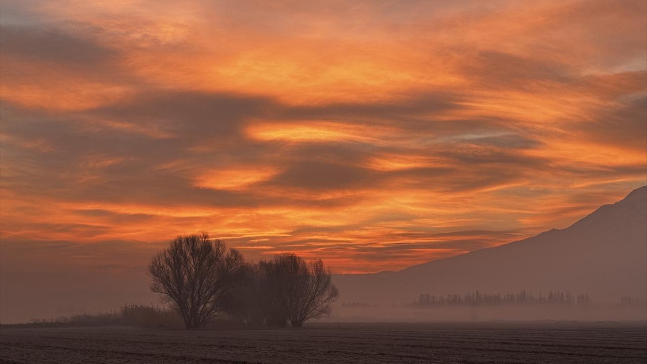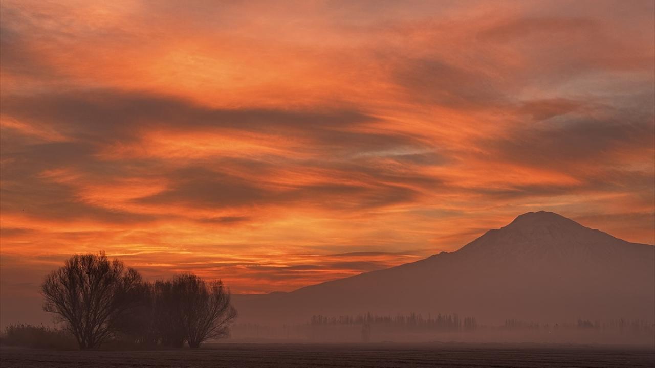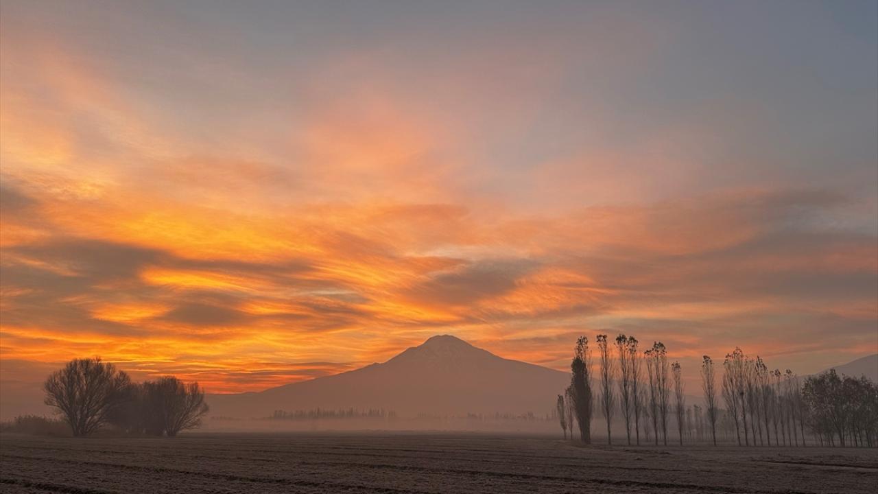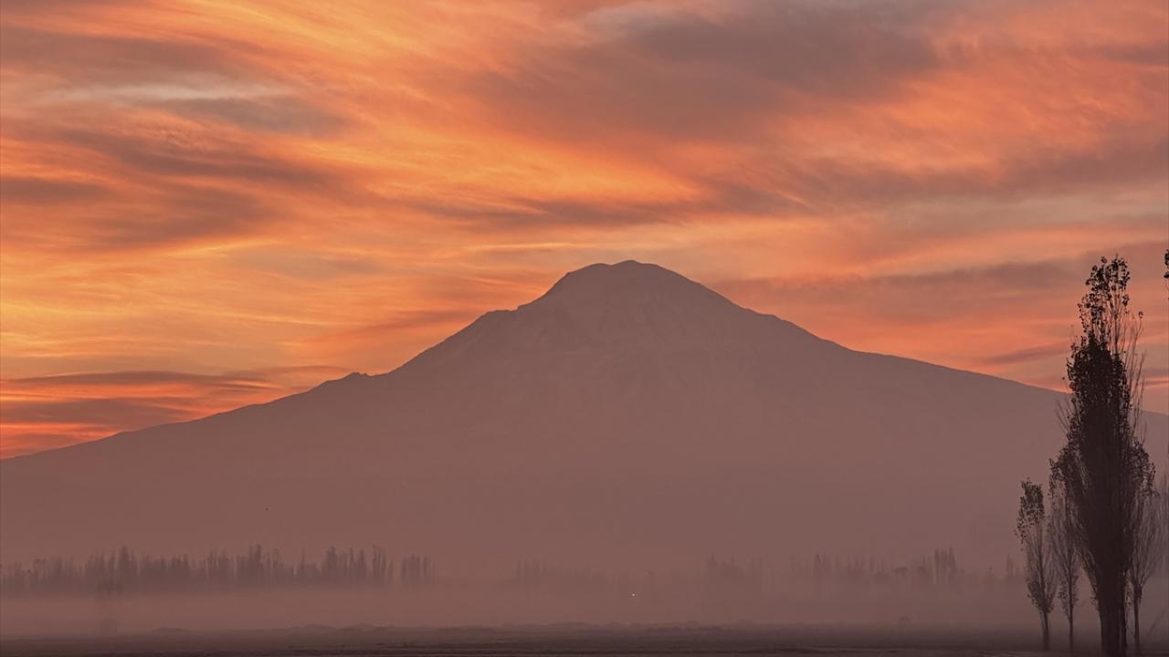 Türkiye'nin en doğusunda yer alan Ağrı Dağı, gün doğumunda sis bulutlarıyla görüntülendi.
