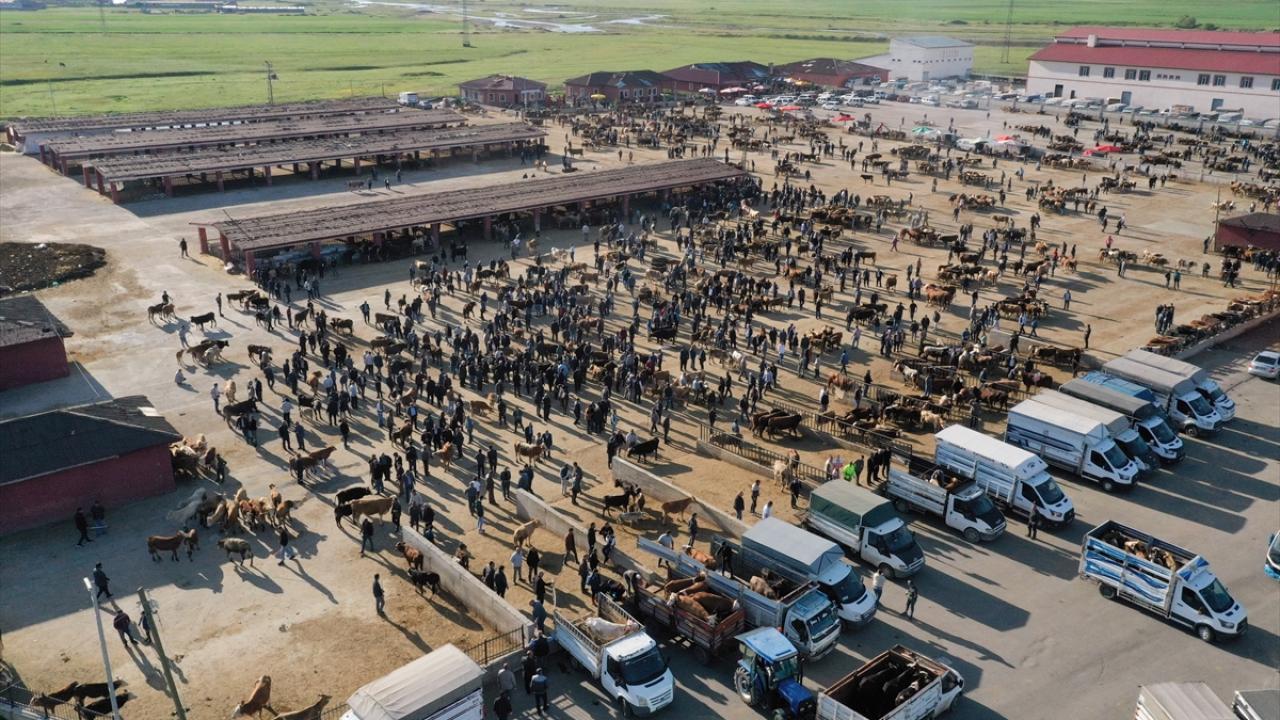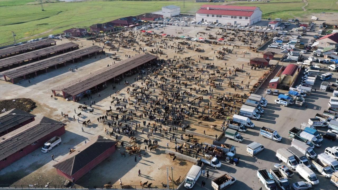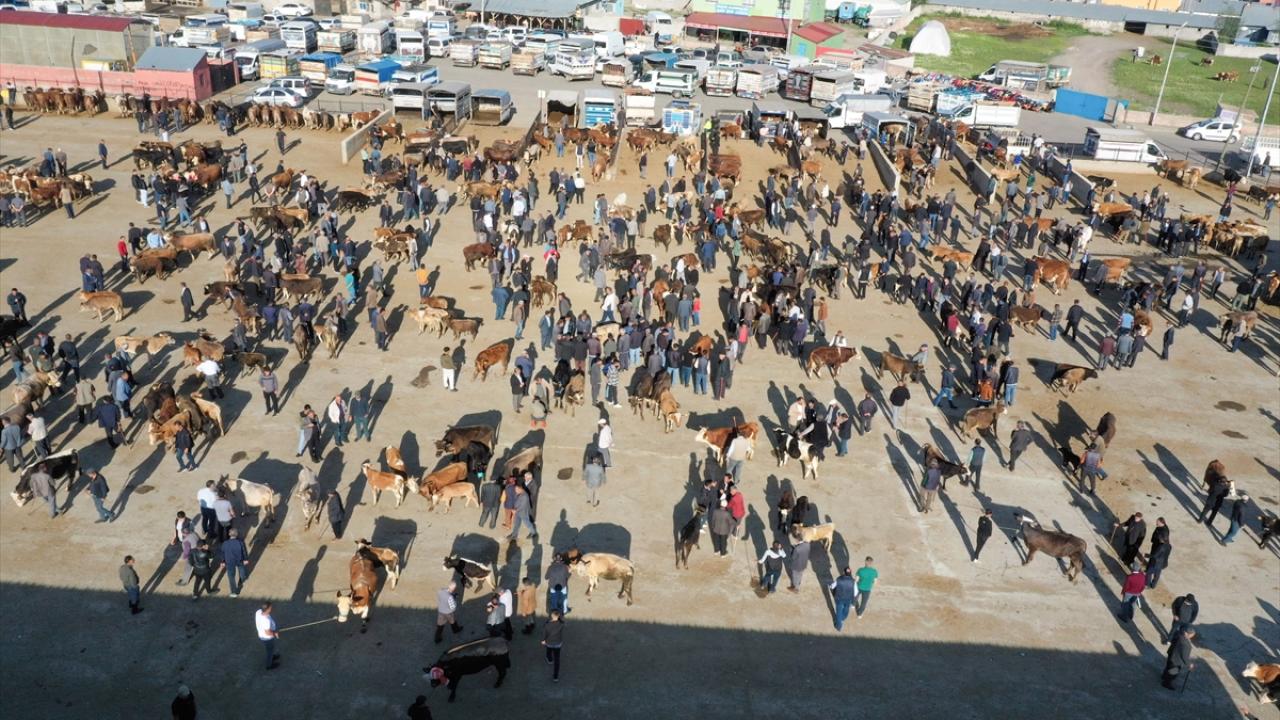 Hayvan pazarındaki yoğunluk, dronla görüntülendi.