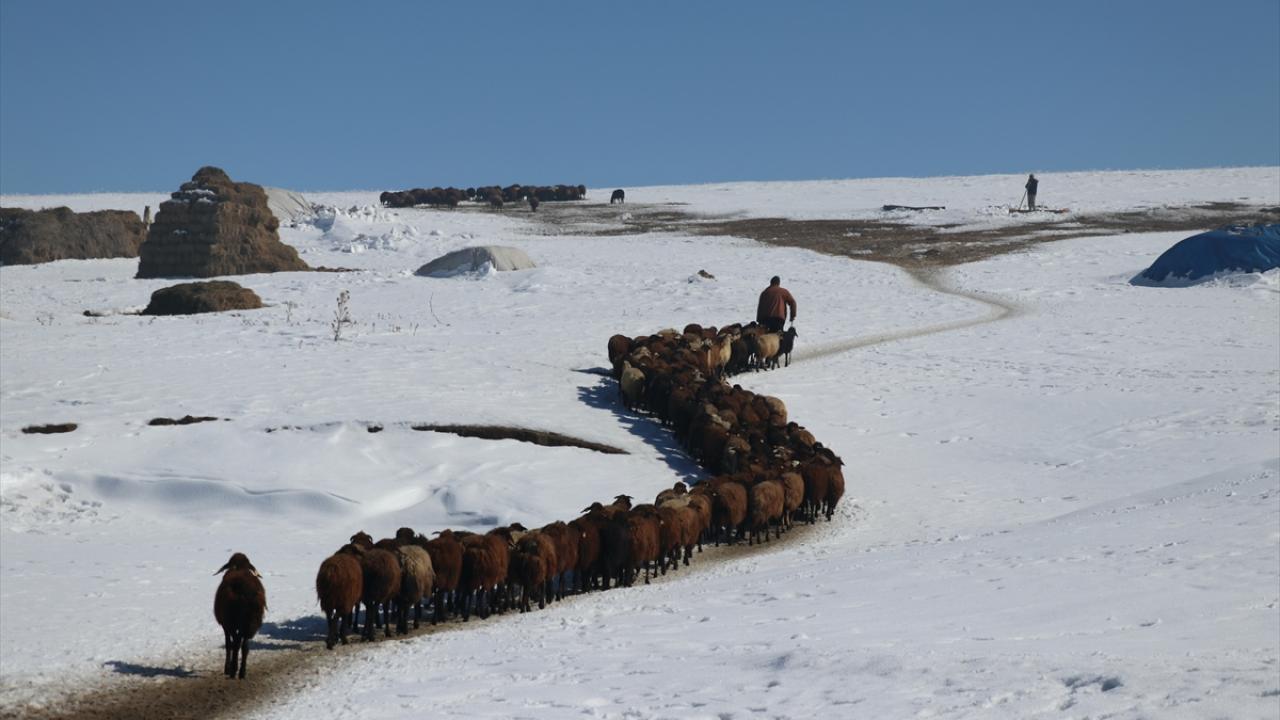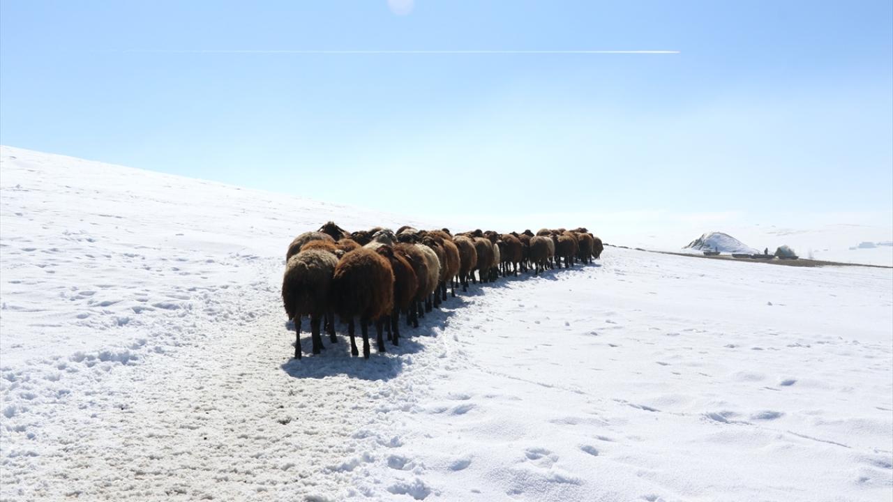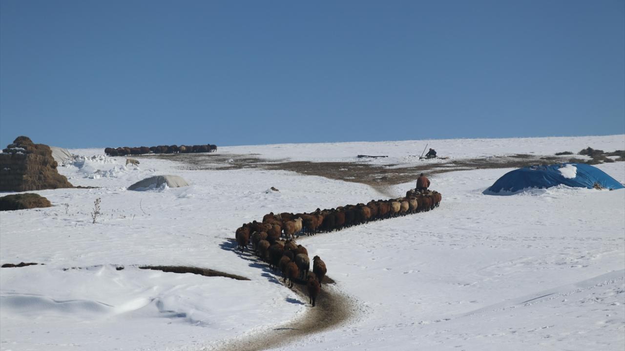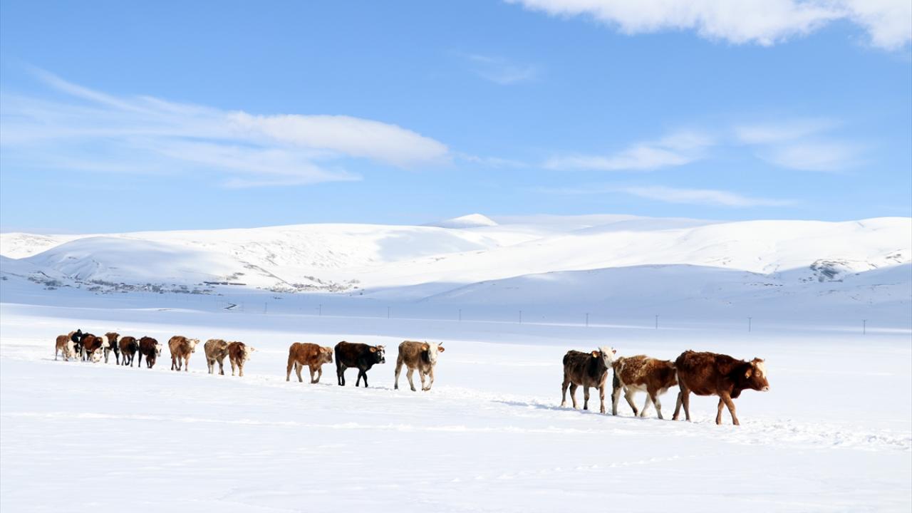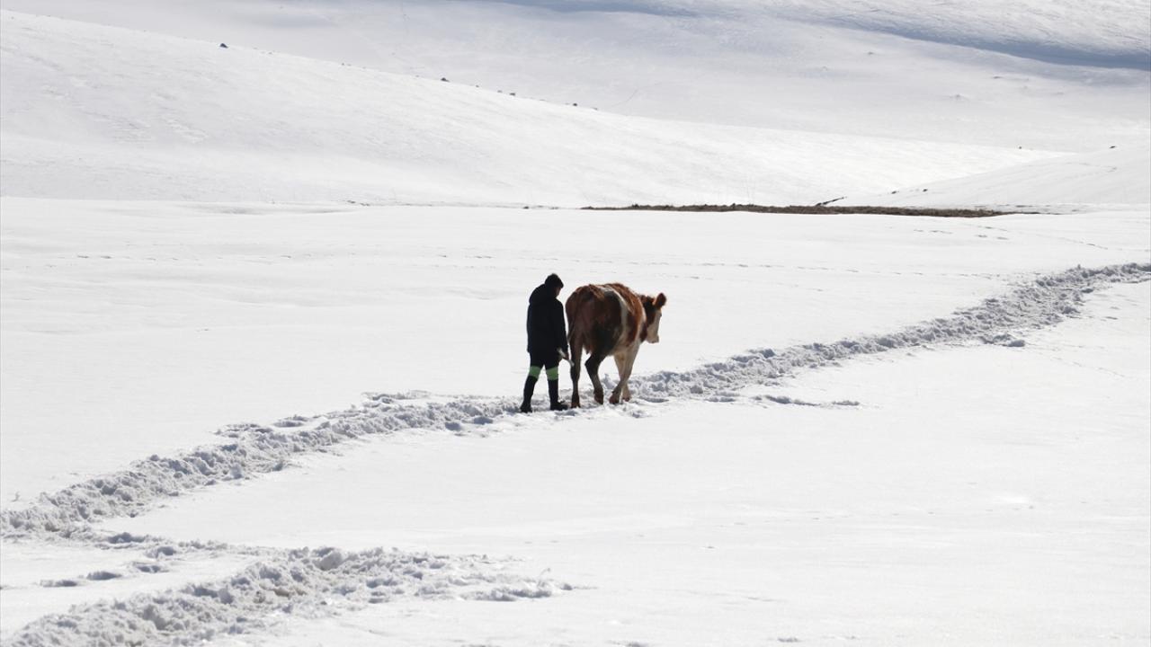 Beyaz örtüyle kaplı arazilerden geçirip derelerde su ihtiyacını karşıladıkları hayvanlarını, kar üzerinde besleyen yöre sakinleri için iklimin zorlukları mart ayında da kendini gösteriyor.