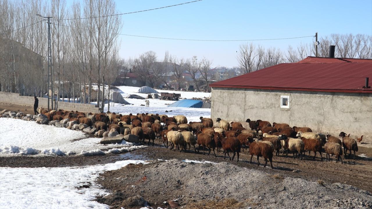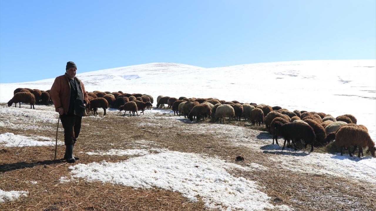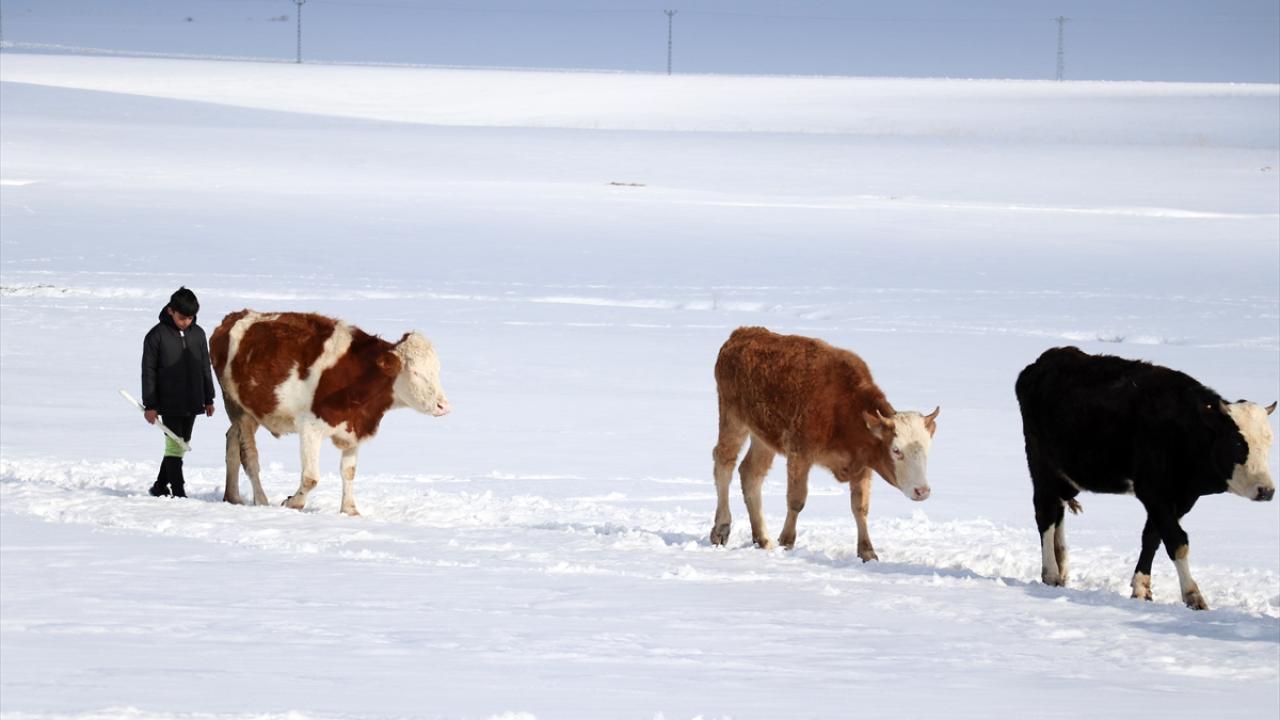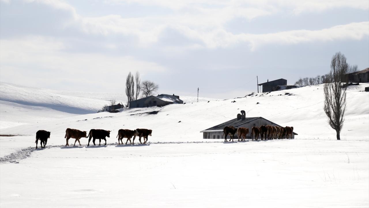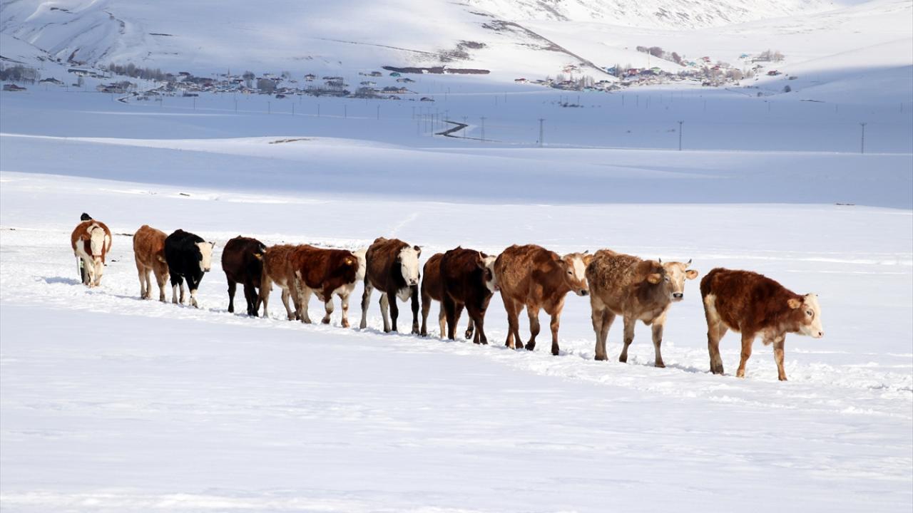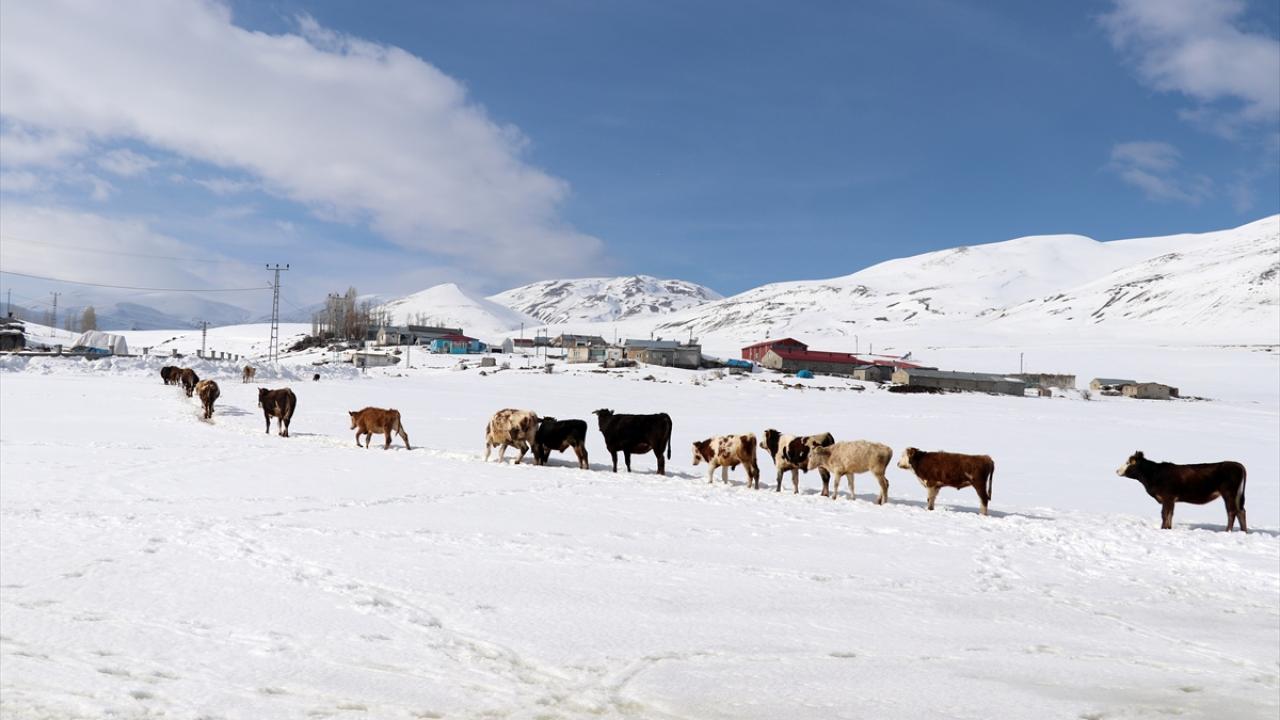 Beyaz örtüyle kaplı arazilerden geçirip derelerde su ihtiyacını karşıladıkları hayvanlarını, kar üzerinde besleyen yöre sakinleri için iklimin zorlukları mart ayında da kendini gösteriyor.